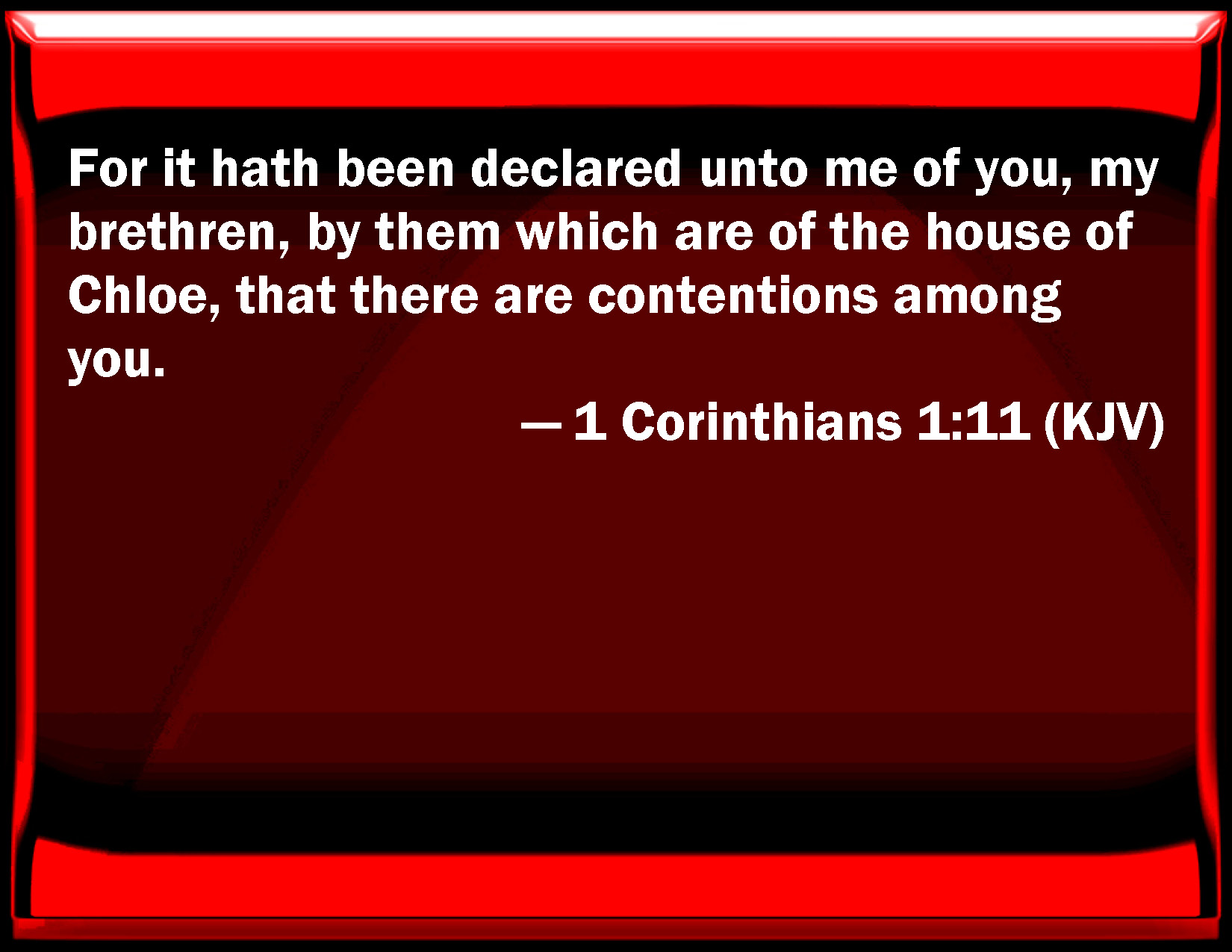 Bible Verse Slide 1 Corinthians 1:11 For it has been declared to me of you, my brothers, by them which are of the house of Chloe, that there are contentions among you. KJV: For it hath been declared unto me of you, my brethren, by them which are of the house of Chloe, that there are contentions among you. DRB: For it hath been signified unto me, my brethren, of you, by them that are of the house of Chloe, that there are contentions among you. DBT: For it has been shewn to me concerning you, my brethren, by those of the house of Chloe, that there are strifes among you. ERV: For it hath been signified unto me concerning you, my brethren, by them which are of the household of Chloe, that there are contentions among you. WBT: For it hath been declared to me concerning you, my brethren, by them who are of the house of Chloe, that there are contentions among you. WEB: For it has been reported to me concerning you, my brothers, by those who are from Chloe's household, that there are contentions among you. YLT: for it was signified to me concerning you, my brethren, by those of Chloe, that contentions are among you;Links 1 Corinthians 1:11 NIV • 1 Corinthians 1:11 NLT • 1 Corinthians 1:11 ESV • 1 Corinthians 1:11 NASB • 1 Corinthians 1:11 KJV • 1 Corinthians 1:11 Interlinear • 1 Corinthians 1:11 Commentaries • 1 Corinthians 1:11 Parallel Texts • 1 Corinthians 1:11 Bible Apps • 1 Corinthians 1:11 Parallel • Bible Hub |