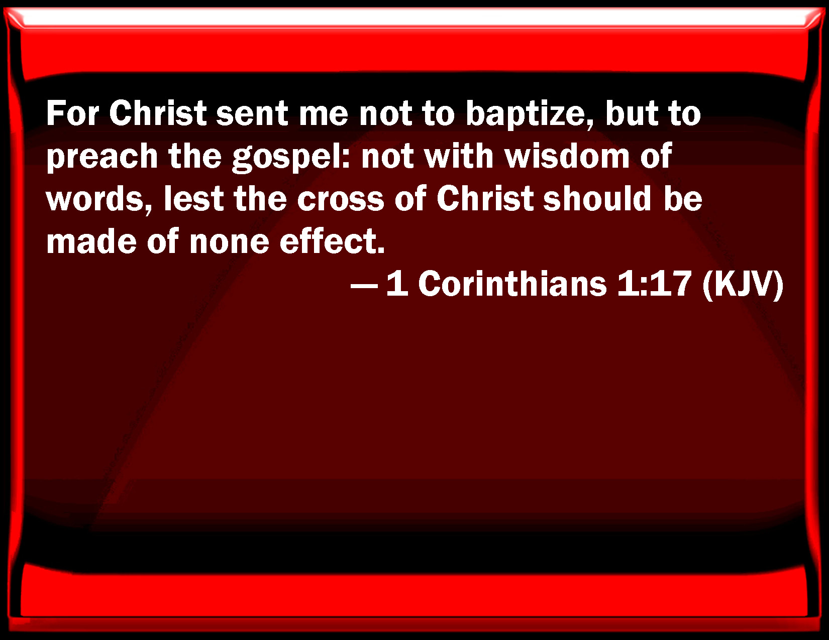 Bible Verse Slide 1 Corinthians 1:17 For Christ sent me not to baptize, but to preach the gospel: not with wisdom of words, lest the cross of Christ should be made of none effect. KJV: For Christ sent me not to baptize, but to preach the gospel: not with wisdom of words, lest the cross of Christ should be made of none effect. DRB: For Christ sent me not to baptize, but to preach the gospel: not in wisdom of speech, lest the cross of Christ should be made void. DBT: For Christ has not sent me to baptise, but to preach glad tidings; not in wisdom of word, that the cross of the Christ may not be made vain. ERV: For Christ sent me not to baptize, but to preach the gospel: not in wisdom of words, lest the cross of Christ should be made void. WBT: For Christ hath not sent me to baptize, but to preach the gospel: not with wisdom of words, lest the cross of Christ should be made of no effect. WEB: For Christ sent me not to baptize, but to preach the Good News—not in wisdom of words, so that the cross of Christ wouldn't be made void. YLT: For Christ did not send me to baptize, but — to proclaim good news; not in wisdom of discourse, that the cross of the Christ may not be made of none effect;Links 1 Corinthians 1:17 NIV • 1 Corinthians 1:17 NLT • 1 Corinthians 1:17 ESV • 1 Corinthians 1:17 NASB • 1 Corinthians 1:17 KJV • 1 Corinthians 1:17 Interlinear • 1 Corinthians 1:17 Commentaries • 1 Corinthians 1:17 Parallel Texts • 1 Corinthians 1:17 Bible Apps • 1 Corinthians 1:17 Parallel • Bible Hub |