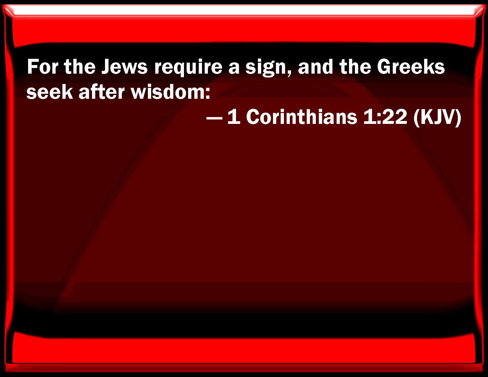 Bible Verse Slide 1 Corinthians 1:22 For the Jews require a sign, and the Greeks seek after wisdom: KJV: For the Jews require a sign, and the Greeks seek after wisdom: DRB: For both the Jews require signs, and the Greeks seek after wisdom: DBT: Since Jews indeed ask for signs, and Greeks seek wisdom; ERV: Seeing that Jews ask for signs, and Greeks seek after wisdom: WBT: For the Jews require a sign, and the Greeks seek wisdom: WEB: For Jews ask for signs, Greeks seek after wisdom, YLT: Since also Jews ask a sign, and Greeks seek wisdom,Links 1 Corinthians 1:22 NIV • 1 Corinthians 1:22 NLT • 1 Corinthians 1:22 ESV • 1 Corinthians 1:22 NASB • 1 Corinthians 1:22 KJV • 1 Corinthians 1:22 Interlinear • 1 Corinthians 1:22 Commentaries • 1 Corinthians 1:22 Parallel Texts • 1 Corinthians 1:22 Bible Apps • 1 Corinthians 1:22 Parallel • Bible Hub |