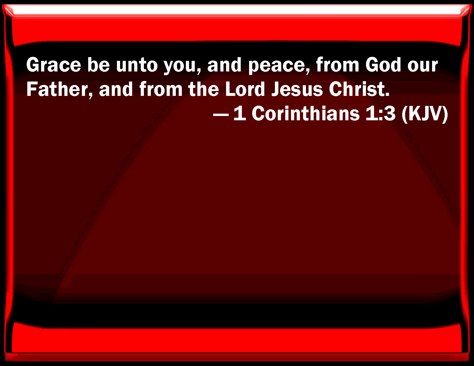 Bible Verse Slide 1 Corinthians 1:3 Grace be to you, and peace, from God our Father, and from the Lord Jesus Christ. KJV: Grace be unto you, and peace, from God our Father, and from the Lord Jesus Christ. DRB: Grace to you, and peace from God our Father, and from the Lord Jesus Christ. DBT: Grace to you and peace from God our Father, and the Lord Jesus Christ. ERV: Grace to you and peace from God our Father and the Lord Jesus Christ. WBT: Grace be to you, and peace from God our Father, and from the Lord Jesus Christ. WEB: Grace to you and peace from God our Father and the Lord Jesus Christ. YLT: Grace to you and peace from God our Father and the Lord Jesus Christ!Links 1 Corinthians 1:3 NIV • 1 Corinthians 1:3 NLT • 1 Corinthians 1:3 ESV • 1 Corinthians 1:3 NASB • 1 Corinthians 1:3 KJV • 1 Corinthians 1:3 Interlinear • 1 Corinthians 1:3 Commentaries • 1 Corinthians 1:3 Parallel Texts • 1 Corinthians 1:3 Bible Apps • 1 Corinthians 1:3 Parallel • Bible Hub |