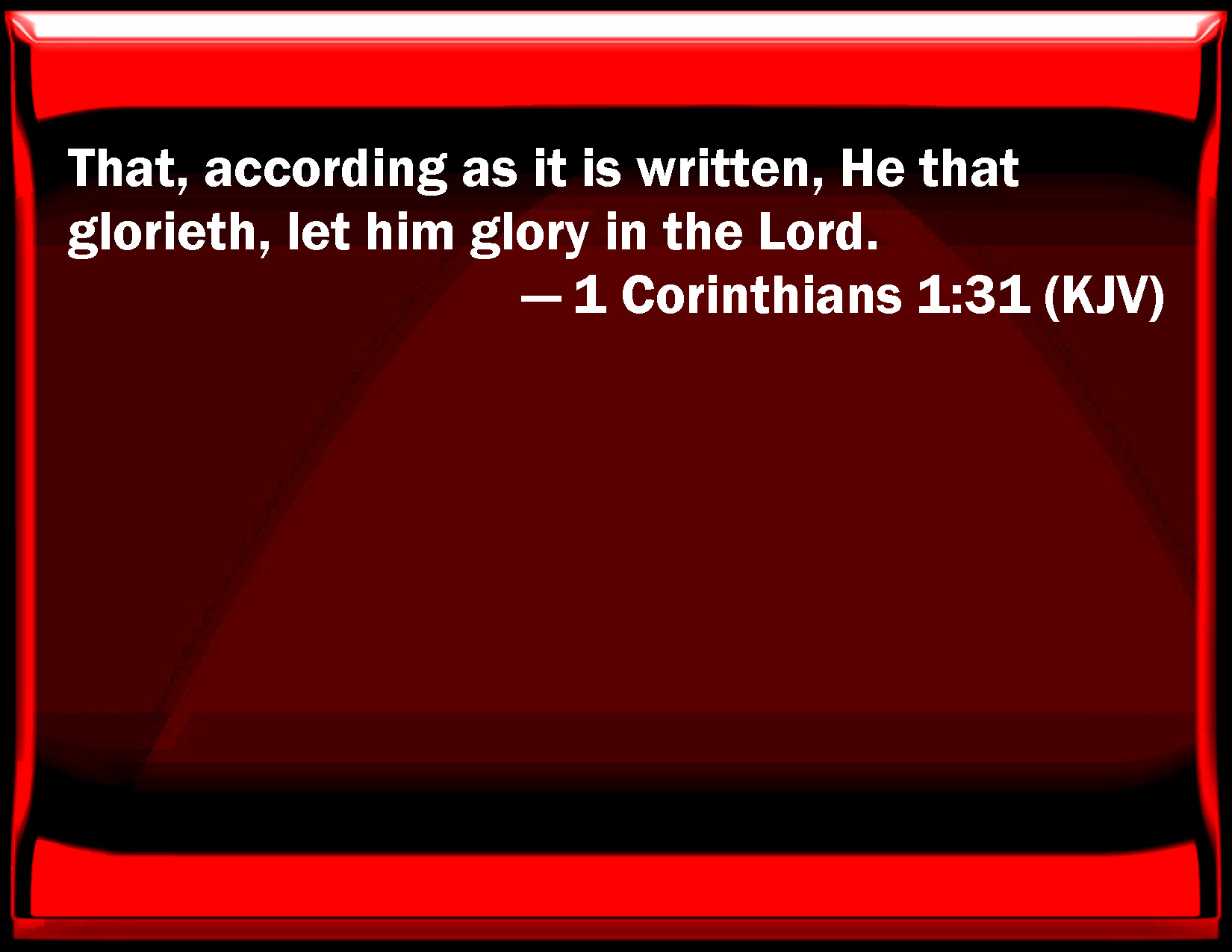 Bible Verse Slide 1 Corinthians 1:31 That, according as it is written, He that glories, let him glory in the Lord. KJV: That, according as it is written, He that glorieth, let him glory in the Lord. DRB: That, as it is written: He that glorieth, may glory in the Lord. DBT: that according as it is written, He that boasts, let him boast in the Lord. ERV: that, according as it is written, He that glorieth, let him glory in the Lord. WBT: That, according as it is written, He that glorieth, let him glory in the Lord. WEB: that, according as it is written, "He who boasts, let him boast in the Lord." YLT: that, according as it hath been written, 'He who is glorying — in the Lord let him glory.'Links 1 Corinthians 1:31 NIV • 1 Corinthians 1:31 NLT • 1 Corinthians 1:31 ESV • 1 Corinthians 1:31 NASB • 1 Corinthians 1:31 KJV • 1 Corinthians 1:31 Interlinear • 1 Corinthians 1:31 Commentaries • 1 Corinthians 1:31 Parallel Texts • 1 Corinthians 1:31 Bible Apps • 1 Corinthians 1:31 Parallel • Bible Hub |