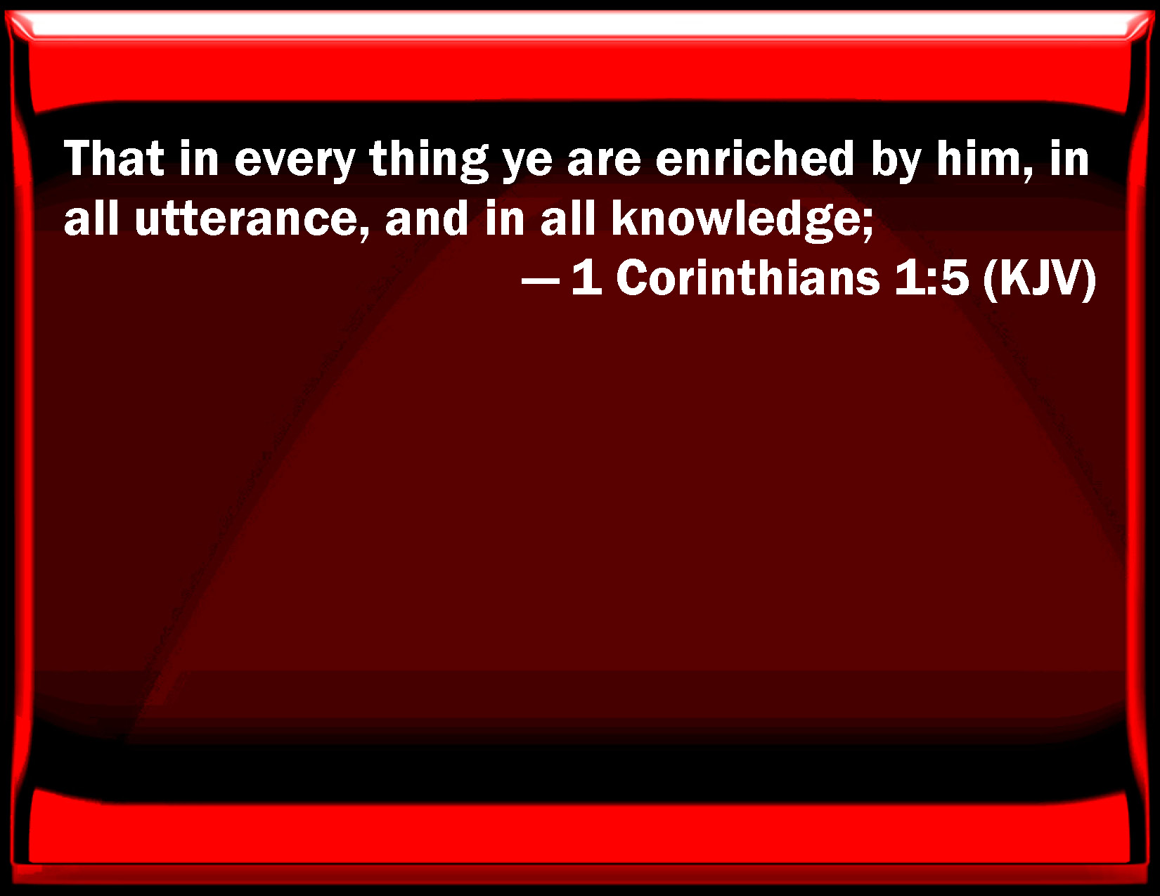 Bible Verse Slide 1 Corinthians 1:5 That in every thing you are enriched by him, in all utterance, and in all knowledge; KJV: That in every thing ye are enriched by him, in all utterance, and in all knowledge; DRB: That in all things you are made rich in him, in all utterance, and in all knowledge; DBT: that in everything ye have been enriched in him, in all word of doctrine, and all knowledge, ERV: that in everything ye were enriched in him, in all utterance and all knowledge; WBT: That in every thing ye are enriched by him, in all utterance, and in all knowledge; WEB: that in everything you were enriched in him, in all speech and all knowledge; YLT: that in every thing ye were enriched in him, in all discourse and all knowledge,Links 1 Corinthians 1:5 NIV • 1 Corinthians 1:5 NLT • 1 Corinthians 1:5 ESV • 1 Corinthians 1:5 NASB • 1 Corinthians 1:5 KJV • 1 Corinthians 1:5 Interlinear • 1 Corinthians 1:5 Commentaries • 1 Corinthians 1:5 Parallel Texts • 1 Corinthians 1:5 Bible Apps • 1 Corinthians 1:5 Parallel • Bible Hub |