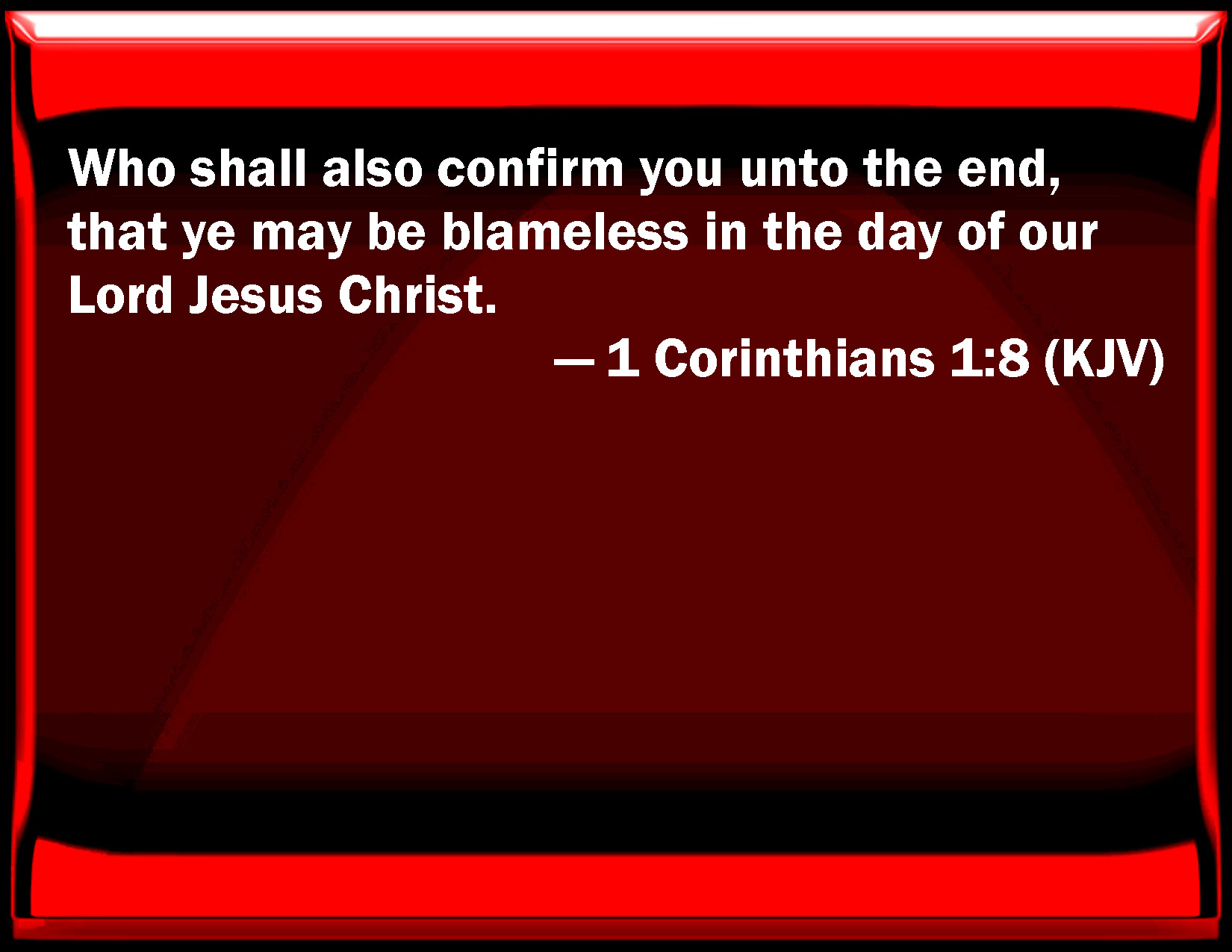 1 Corinthians 1:8 Who shall also confirm you to the end, that you may be blameless in the day of our Lord Jesus Christ.