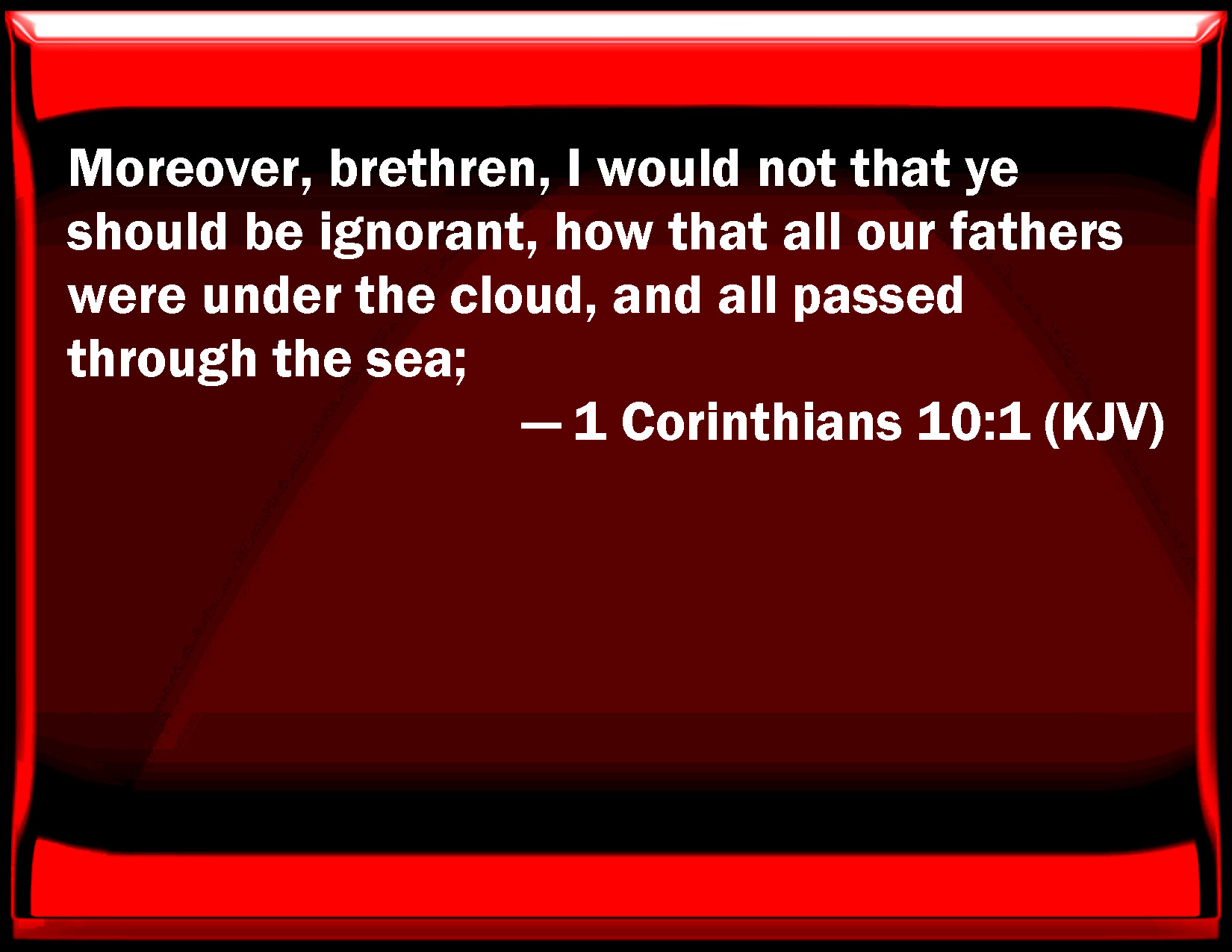 Bible Verse Slide 1 Corinthians 10:1 Moreover, brothers, I would not that you should be ignorant, how that all our fathers were under the cloud, and all passed through the sea; KJV: Moreover, brethren, I would not that ye should be ignorant, how that all our fathers were under the cloud, and all passed through the sea; DRB: FOR I would not have you ignorant, brethren, that our fathers were all under the cloud, and all passed through the sea. DBT: For I would not have you ignorant, brethren, that all our fathers were under the cloud, and all passed through the sea; ERV: For I would not, brethren, have you ignorant, how that our fathers were all under the cloud, and all passed through the sea; WBT: Moreover, brethren, I would not that ye should be ignorant, that all our fathers were under the cloud, and all passed through the sea; WEB: Now I would not have you ignorant, brothers, that our fathers were all under the cloud, and all passed through the sea; YLT: And I do not wish you to be ignorant, brethren, that all our fathers were under the cloud, and all passed through the sea,Links 1 Corinthians 10:1 NIV • 1 Corinthians 10:1 NLT • 1 Corinthians 10:1 ESV • 1 Corinthians 10:1 NASB • 1 Corinthians 10:1 KJV • 1 Corinthians 10:1 Interlinear • 1 Corinthians 10:1 Commentaries • 1 Corinthians 10:1 Parallel Texts • 1 Corinthians 10:1 Bible Apps • 1 Corinthians 10:1 Parallel • Bible Hub |