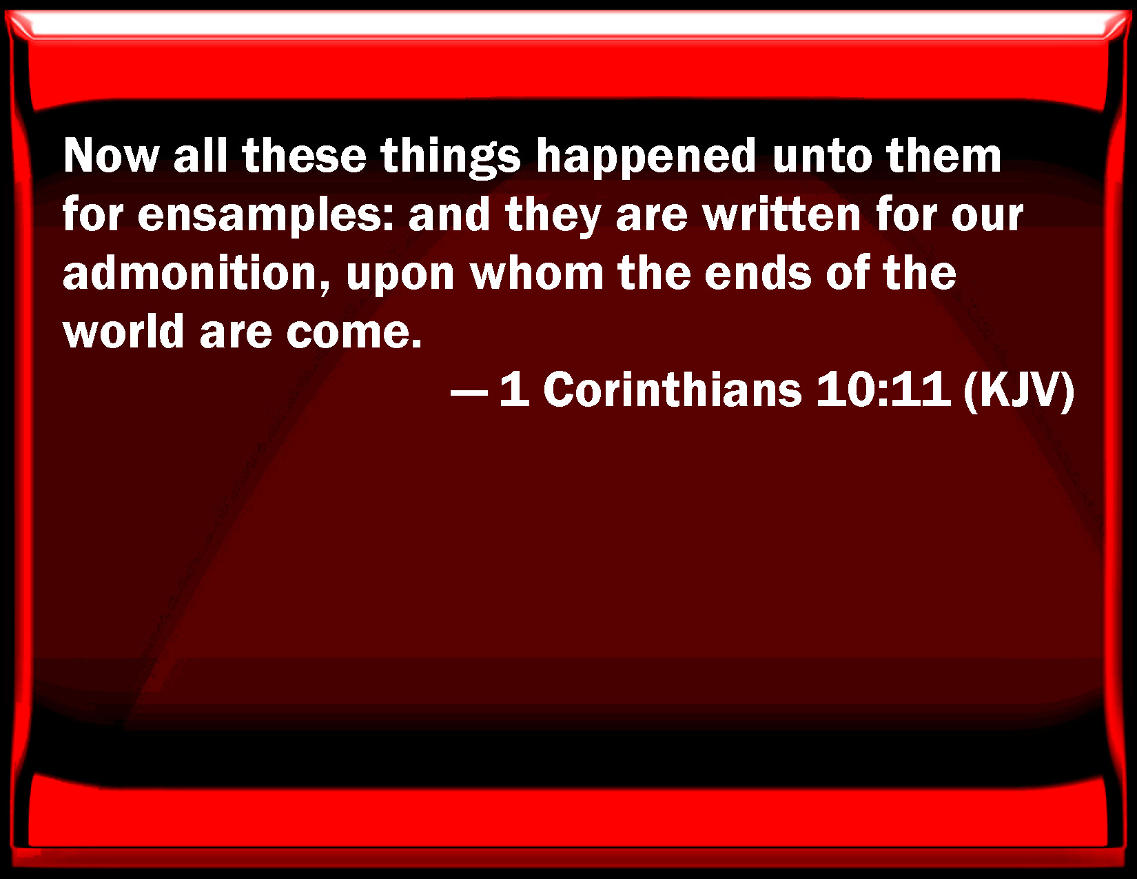 Bible Verse Slide 1 Corinthians 10:11 Now all these things happened to them for ensamples: and they are written for our admonition, on whom the ends of the world are come. KJV: Now all these things happened unto them for ensamples: and they are written for our admonition, upon whom the ends of the world are come. DRB: Now all these things happened to them in figure: and they are written for our correction, upon whom the ends of the world are come. DBT: Now all these things happened to them as types, and have been written for our admonition, upon whom the ends of the ages are come. ERV: Now these things happened unto them by way of example; and they were written for our admonition, upon whom the ends of the ages are come. WBT: Now all these things happened to them for examples: and they are written for our admonition, upon whom the ends of the world are come. WEB: Now all these things happened to them by way of example, and they were written for our admonition, on whom the ends of the ages have come. YLT: And all these things as types did happen to those persons, and they were written for our admonition, to whom the end of the ages did come,Links 1 Corinthians 10:11 NIV • 1 Corinthians 10:11 NLT • 1 Corinthians 10:11 ESV • 1 Corinthians 10:11 NASB • 1 Corinthians 10:11 KJV • 1 Corinthians 10:11 Interlinear • 1 Corinthians 10:11 Commentaries • 1 Corinthians 10:11 Parallel Texts • 1 Corinthians 10:11 Bible Apps • 1 Corinthians 10:11 Parallel • Bible Hub |