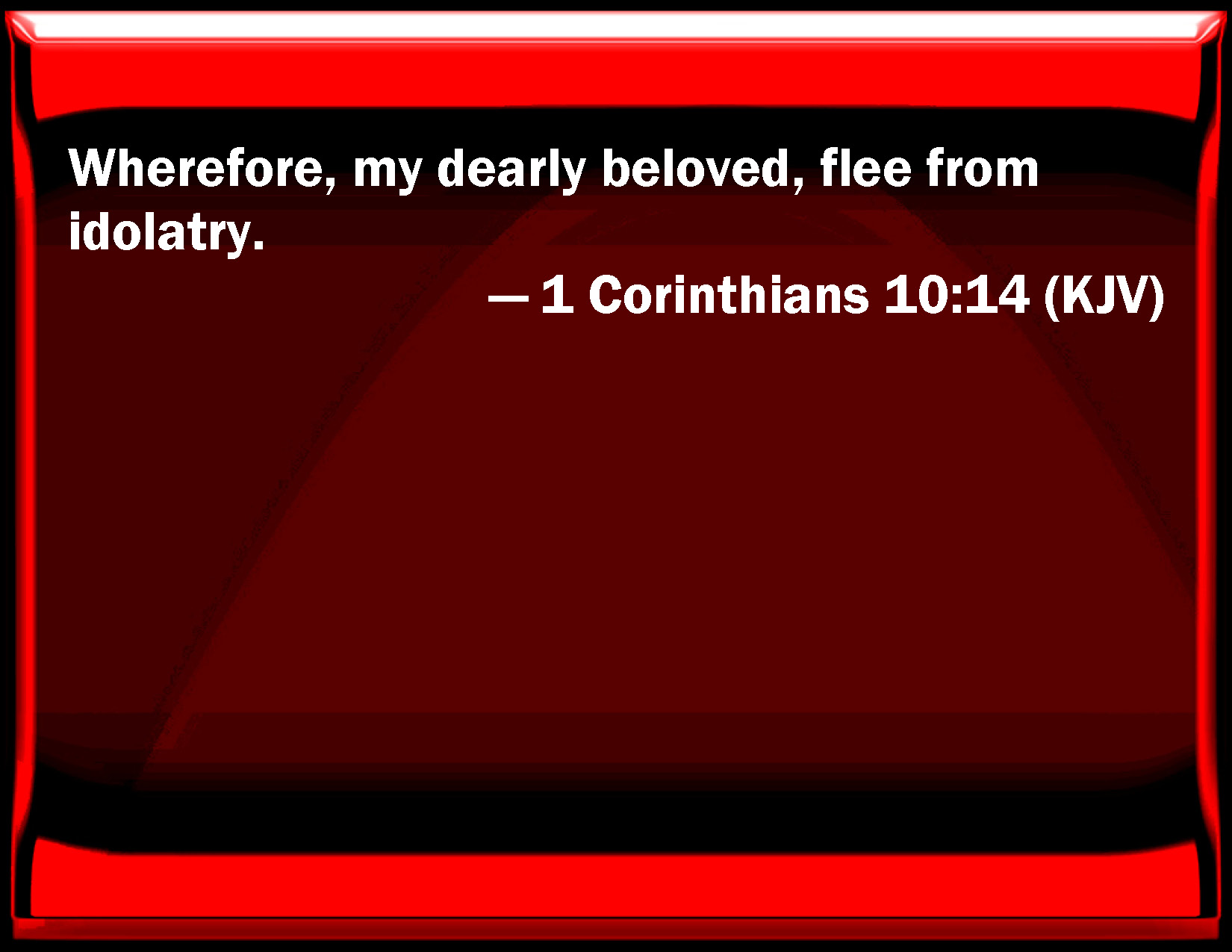 Bible Verse Slide 1 Corinthians 10:14 Why, my dearly beloved, flee from idolatry. KJV: Wherefore, my dearly beloved, flee from idolatry. DRB: Wherefore, my dearly beloved, fly from the service of idols. DBT: Wherefore, my beloved, flee from idolatry. ERV: Wherefore, my beloved, flee from idolatry. WBT: Wherefore, my dearly beloved, flee from idolatry. WEB: Therefore, my beloved, flee from idolatry. YLT: Wherefore, my beloved, flee from the idolatry;Links 1 Corinthians 10:14 NIV • 1 Corinthians 10:14 NLT • 1 Corinthians 10:14 ESV • 1 Corinthians 10:14 NASB • 1 Corinthians 10:14 KJV • 1 Corinthians 10:14 Interlinear • 1 Corinthians 10:14 Commentaries • 1 Corinthians 10:14 Parallel Texts • 1 Corinthians 10:14 Bible Apps • 1 Corinthians 10:14 Parallel • Bible Hub |