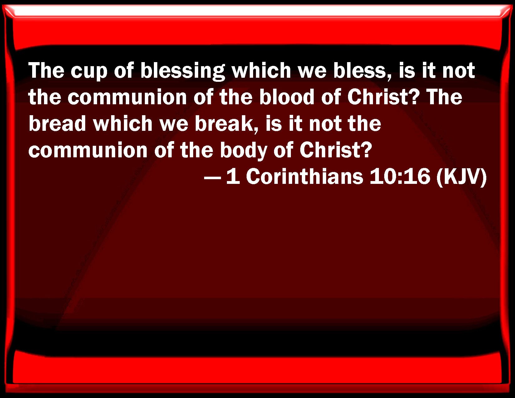 Bible Verse Slide 1 Corinthians 10:16 The cup of blessing which we bless, is it not the communion of the blood of Christ? The bread which we break, is it not the communion of the body of Christ? KJV: The cup of blessing which we bless, is it not the communion of the blood of Christ? The bread which we break, is it not the communion of the body of Christ? DRB: The chalice of benediction, which we bless, is it not the communion of the blood of Christ ? And the bread, which we break, is it not the partaking of the body of the Lord ? DBT: The cup of blessing which we bless, is it not the communion of the blood of the Christ? The bread which we break, is it not the communion of the body of the Christ? ERV: The cup of blessing which we bless, is it not a communion of the blood of Christ? The bread which we break, is it not a communion of the body of Christ? WBT: The cup of blessing which we bless, is it not the communion of the blood of Christ? The bread which we break, is it not the communion of the body of Christ? WEB: The cup of blessing which we bless, isn't it a sharing of the blood of Christ? The bread which we break, isn't it a sharing of the body of Christ? YLT: The cup of the blessing that we bless — is it not the fellowship of the blood of the Christ? the bread that we break — is it not the fellowship of the body of the Christ?Links 1 Corinthians 10:16 NIV • 1 Corinthians 10:16 NLT • 1 Corinthians 10:16 ESV • 1 Corinthians 10:16 NASB • 1 Corinthians 10:16 KJV • 1 Corinthians 10:16 Interlinear • 1 Corinthians 10:16 Commentaries • 1 Corinthians 10:16 Parallel Texts • 1 Corinthians 10:16 Bible Apps • 1 Corinthians 10:16 Parallel • Bible Hub |