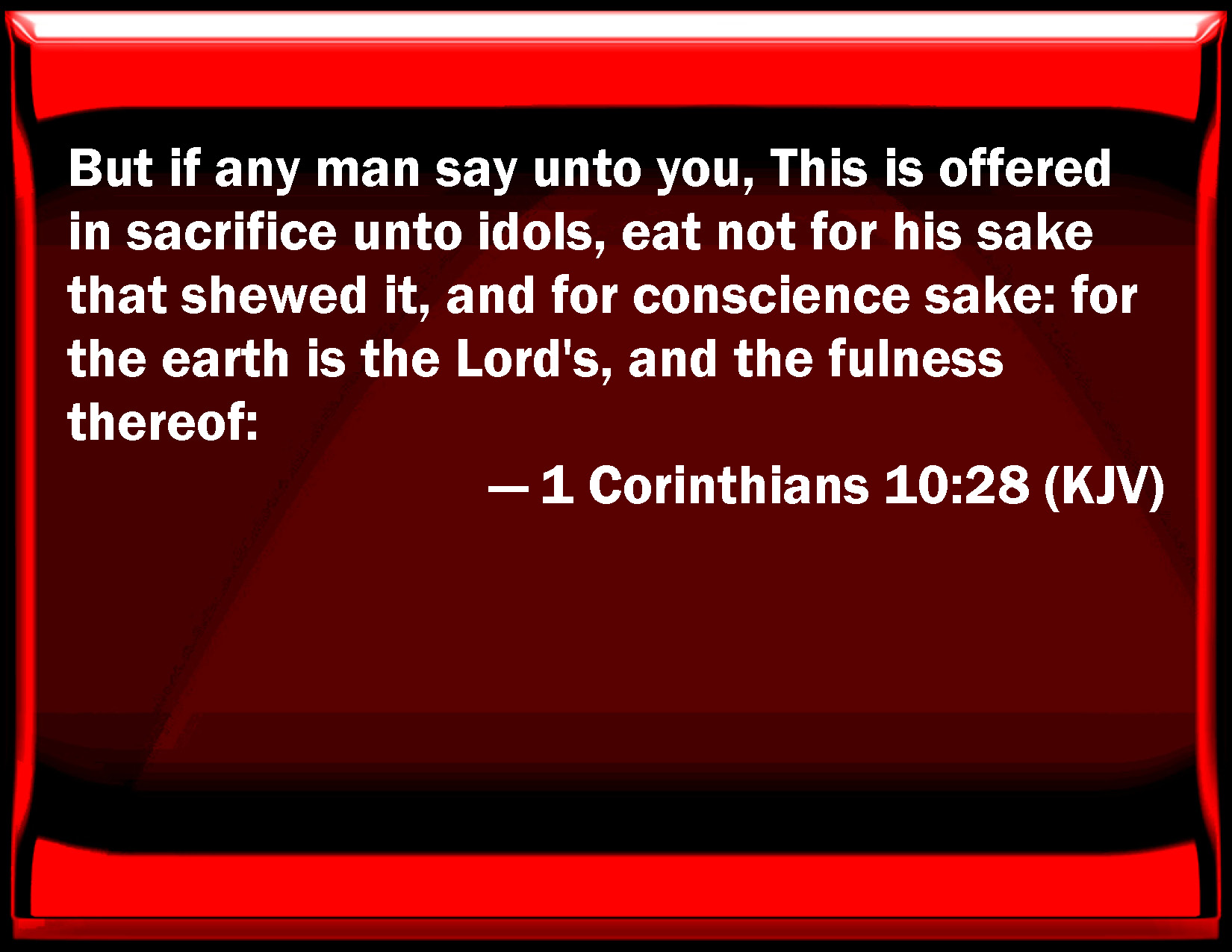 Bible Verse Slide 1 Corinthians 10:28 But if any man say to you, This is offered in sacrifice to idols, eat not for his sake that showed it, and for conscience sake: for the earth is the Lord's, and the fullness thereof: KJV: But if any man say unto you, This is offered in sacrifice unto idols, eat not for his sake that shewed it, and for conscience sake: for the earth is the Lord's, and the fulness thereof: DRB: But if any man say: This has been sacrificed to idols, do not eat of it for his sake that told it, and for conscience' sake. DBT: But if any one say to you, This is offered to holy purposes, do not eat, for his sake that pointed it out, and conscience sake; ERV: But if any man say unto you, This hath been offered in sacrifice, eat not, for his sake that shewed it, and for conscience sake: WBT: But if any man shall say to you, This is offered in sacrifice to idols, eat not for his sake that showed it, and for conscience' sake: for the earth is the Lord's, and its fullness: WEB: But if anyone says to you, "This was offered to idols," don't eat it for the sake of the one who told you, and for the sake of conscience. For "the earth is the Lord's, and all its fullness." YLT: and if any one may say to you, 'This is a thing sacrificed to an idol,' — do not eat, because of that one who shewed it, and of the conscience, for the Lord's is the earth and its fulness:Links 1 Corinthians 10:28 NIV • 1 Corinthians 10:28 NLT • 1 Corinthians 10:28 ESV • 1 Corinthians 10:28 NASB • 1 Corinthians 10:28 KJV • 1 Corinthians 10:28 Interlinear • 1 Corinthians 10:28 Commentaries • 1 Corinthians 10:28 Parallel Texts • 1 Corinthians 10:28 Bible Apps • 1 Corinthians 10:28 Parallel • Bible Hub |