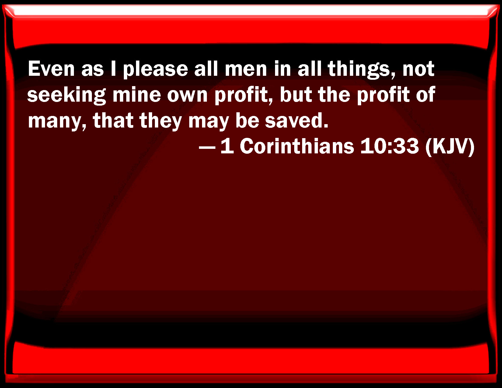 Bible Verse Slide 1 Corinthians 10:33 Even as I please all men in all things, not seeking my own profit, but the profit of many, that they may be saved. KJV: Even as I please all men in all things, not seeking mine own profit, but the profit of many, that they may be saved. DRB: As I also in all things please all men, not seeking that which is profitable to myself, but to many, that may be saved. DBT: Even as I also please all in all things; not seeking my own profit, but that of the many, that they may be saved. ERV: even as I also please all men in all things, not seeking mine own profit, but the profit of the many, that they may be saved. WBT: Even as I please all men in all things, not seeking my own profit, but the profit of many, that they may be saved. WEB: even as I also please all men in all things, not seeking my own profit, but the profit of the many, that they may be saved. YLT: as I also in all things do please all, not seeking my own profit, but that of many — that they may be saved.Links 1 Corinthians 10:33 NIV • 1 Corinthians 10:33 NLT • 1 Corinthians 10:33 ESV • 1 Corinthians 10:33 NASB • 1 Corinthians 10:33 KJV • 1 Corinthians 10:33 Interlinear • 1 Corinthians 10:33 Commentaries • 1 Corinthians 10:33 Parallel Texts • 1 Corinthians 10:33 Bible Apps • 1 Corinthians 10:33 Parallel • Bible Hub |