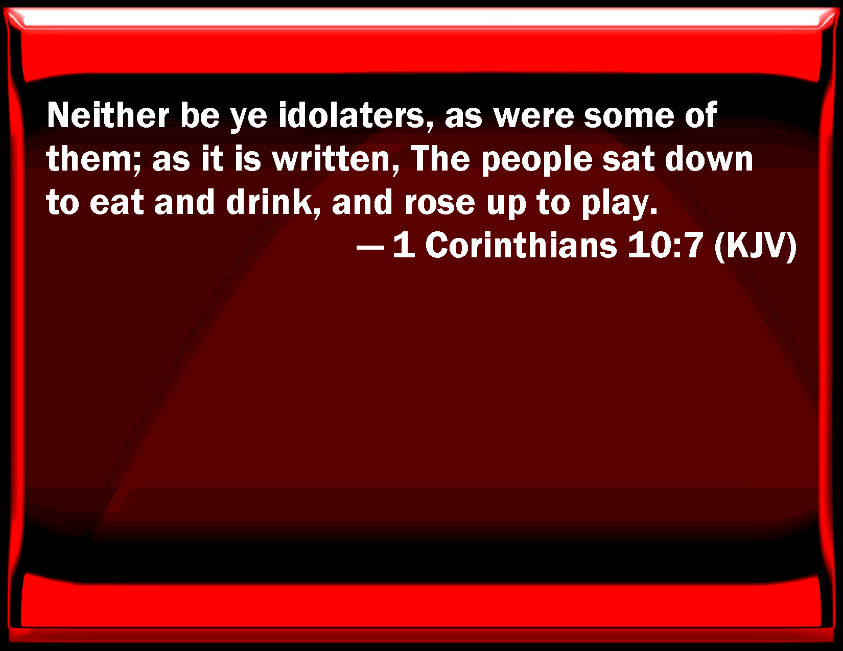 Bible Verse Slide 1 Corinthians 10:7 Neither be you idolaters, as were some of them; as it is written, The people sat down to eat and drink, and rose up to play. KJV: Neither be ye idolaters, as were some of them; as it is written, The people sat down to eat and drink, and rose up to play. DRB: Neither become ye idolaters, as some of them, as it is written: The people sat down to eat and drink, and rose up to play. DBT: Neither be ye idolaters, as some of them; as it is written, The people sat down to eat and to drink, and rose up to play. ERV: Neither be ye idolaters, as were some of them; as it is written, The people sat down to eat and drink, and rose up to play. WBT: Neither be ye idolaters, as were some of them: as it is written, The people sat down to eat and drink, and rose up to play. WEB: Neither be idolaters, as some of them were. As it is written, "The people sat down to eat and drink, and rose up to play." YLT: Neither become ye idolaters, as certain of them, as it hath been written, 'The people sat down to eat and to drink, and stood up to play;'Links 1 Corinthians 10:7 NIV • 1 Corinthians 10:7 NLT • 1 Corinthians 10:7 ESV • 1 Corinthians 10:7 NASB • 1 Corinthians 10:7 KJV • 1 Corinthians 10:7 Interlinear • 1 Corinthians 10:7 Commentaries • 1 Corinthians 10:7 Parallel Texts • 1 Corinthians 10:7 Bible Apps • 1 Corinthians 10:7 Parallel • Bible Hub |