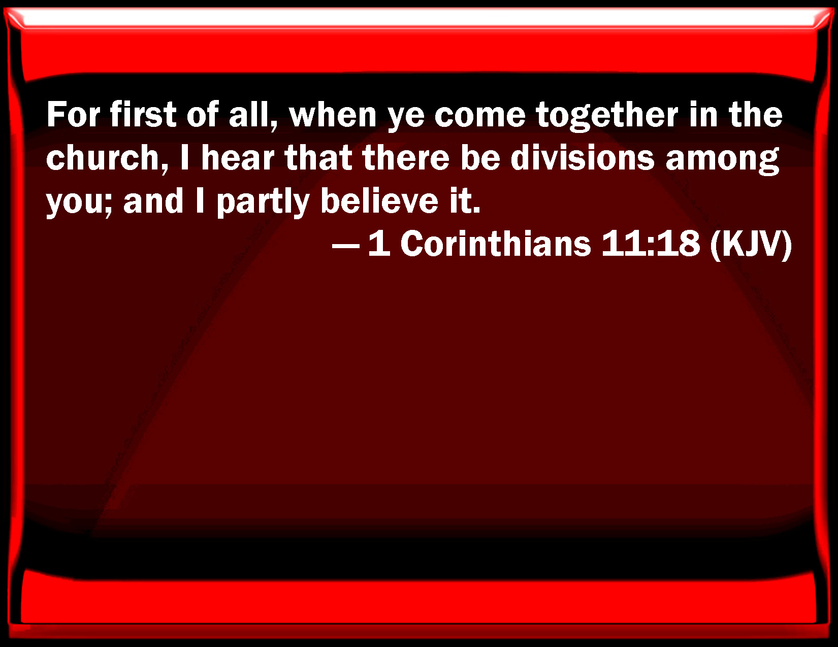 Bible Verse Slide 1 Corinthians 11:18 For first of all, when you come together in the church, I hear that there be divisions among you; and I partly believe it. KJV: For first of all, when ye come together in the church, I hear that there be divisions among you; and I partly believe it. DRB: For first of all I hear that when you come together in the church, there are schisms among you; and in part I believe it. DBT: For first, when ye come together in assembly, I hear there exist divisions among you, and I partly give credit to it. ERV: For first of all, when ye come together in the church, I hear that divisions exist among you; and I partly believe it. WBT: For first of all, when ye come together in the church, I hear that there are divisions among you; and I partly believe it. WEB: For first of all, when you come together in the assembly, I hear that divisions exist among you, and I partly believe it. YLT: for first, indeed, ye coming together in an assembly, I hear of divisions being among you, and partly I believe it,Links 1 Corinthians 11:18 NIV • 1 Corinthians 11:18 NLT • 1 Corinthians 11:18 ESV • 1 Corinthians 11:18 NASB • 1 Corinthians 11:18 KJV • 1 Corinthians 11:18 Interlinear • 1 Corinthians 11:18 Commentaries • 1 Corinthians 11:18 Parallel Texts • 1 Corinthians 11:18 Bible Apps • 1 Corinthians 11:18 Parallel • Bible Hub |