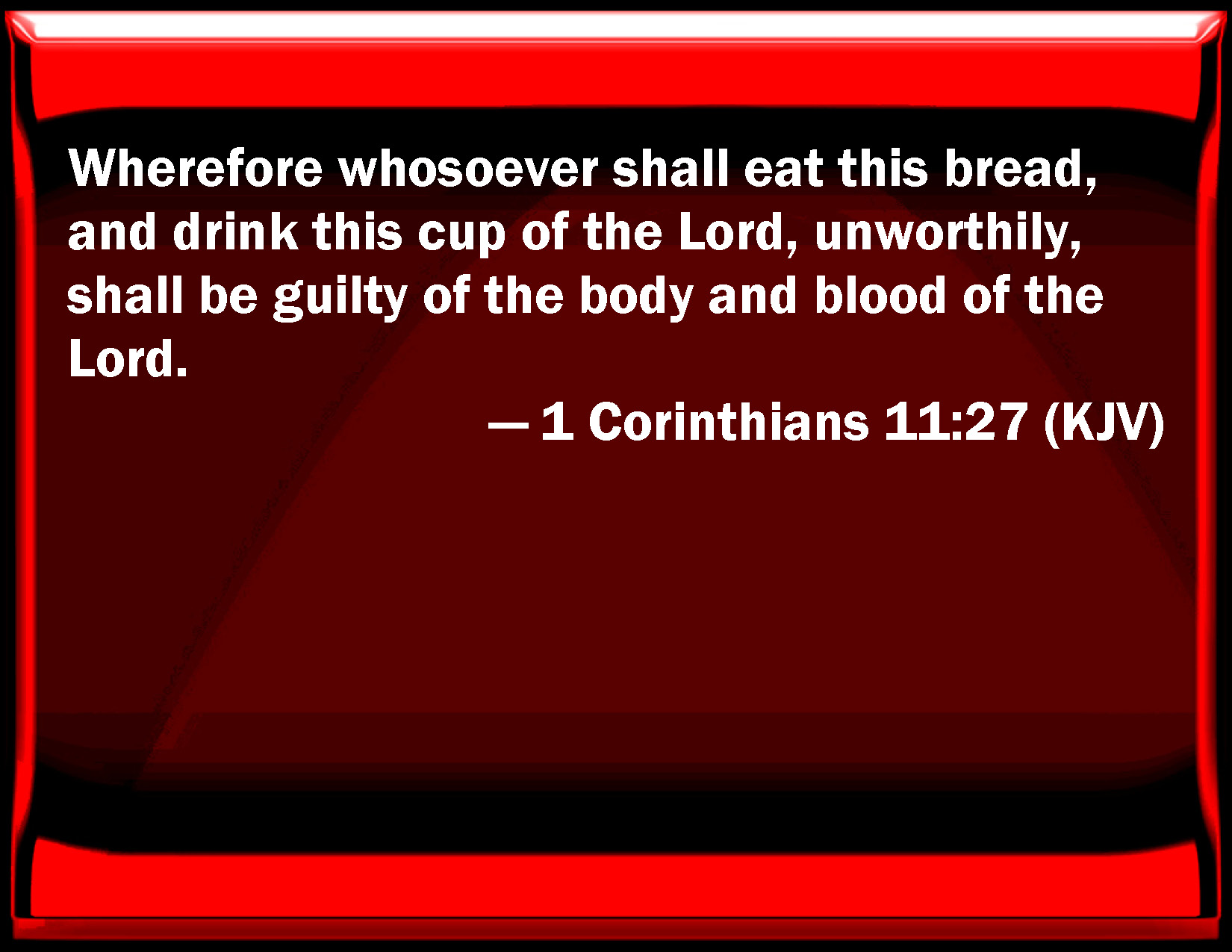 Bible Verse Slide 1 Corinthians 11:27 Why whoever shall eat this bread, and drink this cup of the Lord, unworthily, shall be guilty of the body and blood of the Lord. KJV: Wherefore whosoever shall eat this bread, and drink this cup of the Lord, unworthily, shall be guilty of the body and blood of the Lord. DRB: Therefore whosoever shall eat this bread, or drink the chalice of the Lord unworthily, shall be guilty of the body and of the blood of the Lord. DBT: So that whosoever shall eat the bread, or drink the cup of the Lord, unworthily, shall be guilty in respect of the body and of the blood of the Lord. ERV: Wherefore whosoever shall eat the bread or drink the cup of the Lord unworthily, shall be guilty of the body and the blood of the Lord. WBT: Wherefore, whoever shall eat this bread, and drink this cup of the Lord unworthily, shall be guilty of the body and blood of the Lord. WEB: Therefore whoever eats this bread or drinks the Lord's cup in a way unworthy of the Lord will be guilty of the body and the blood of the Lord. YLT: so that whoever may eat this bread or may drink the cup of the Lord unworthily, guilty he shall be of the body and blood of the Lord:Links 1 Corinthians 11:27 NIV • 1 Corinthians 11:27 NLT • 1 Corinthians 11:27 ESV • 1 Corinthians 11:27 NASB • 1 Corinthians 11:27 KJV • 1 Corinthians 11:27 Interlinear • 1 Corinthians 11:27 Commentaries • 1 Corinthians 11:27 Parallel Texts • 1 Corinthians 11:27 Bible Apps • 1 Corinthians 11:27 Parallel • Bible Hub |