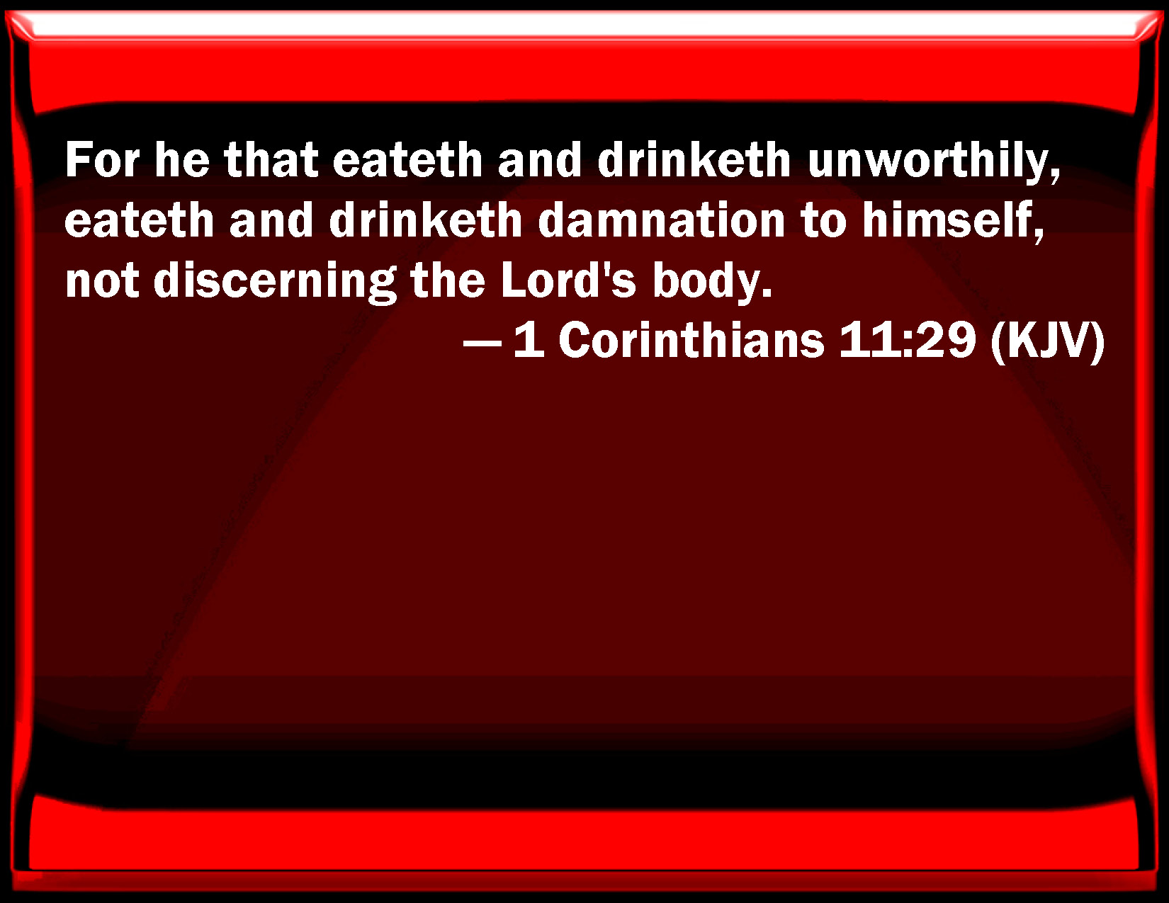 Bible Verse Slide 1 Corinthians 11:29 For he that eats and drinks unworthily, eats and drinks damnation to himself, not discerning the Lord's body. KJV: For he that eateth and drinketh unworthily, eateth and drinketh damnation to himself, not discerning the Lord's body. DRB: For he that eateth and drinketh unworthily, eateth and drinketh judgment to himself, not discerning the body of the Lord. DBT: For the eater and drinker eats and drinks judgment to himself, not distinguishing the body. ERV: For he that eateth and drinketh, eateth and drinketh judgment unto himself, if he discern not the body. WBT: For he that eateth and drinketh unworthily, eateth and drinketh condemnation to himself, not discerning the Lord's body. WEB: For he who eats and drinks in an unworthy way eats and drinks judgment to himself, if he doesn't discern the Lord's body. YLT: for he who is eating and drinking unworthily, judgment to himself he doth eat and drink — not discerning the body of the Lord.Links 1 Corinthians 11:29 NIV • 1 Corinthians 11:29 NLT • 1 Corinthians 11:29 ESV • 1 Corinthians 11:29 NASB • 1 Corinthians 11:29 KJV • 1 Corinthians 11:29 Interlinear • 1 Corinthians 11:29 Commentaries • 1 Corinthians 11:29 Parallel Texts • 1 Corinthians 11:29 Bible Apps • 1 Corinthians 11:29 Parallel • Bible Hub |