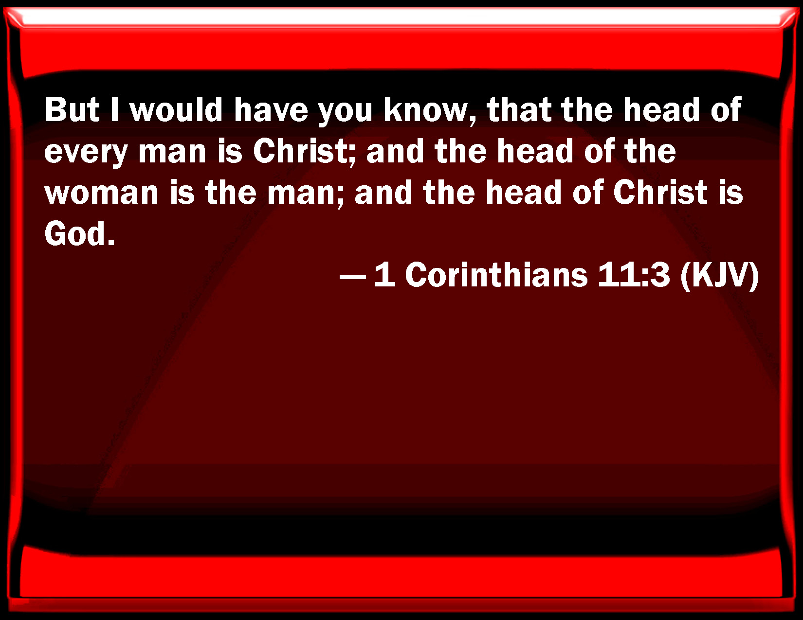 Bible Verse Slide 1 Corinthians 11:3 But I would have you know, that the head of every man is Christ; and the head of the woman is the man; and the head of Christ is God. KJV: But I would have you know, that the head of every man is Christ; and the head of the woman is the man; and the head of Christ is God. DRB: But I would have you know, that the head of every man is Christ; and the head of the woman is the man; and the head of Christ is God. DBT: But I wish you to know that the Christ is the head of every man, but woman's head is the man, and the Christ's head God. ERV: But I would have you know, that the head of every man is Christ; and the head of the woman is the man; and the head of Christ is God. WBT: But I would have you know, that the head of every man is Christ; and the head of the woman is the man; and the head of Christ is God. WEB: But I would have you know that the head of every man is Christ, and the head of the woman is the man, and the head of Christ is God. YLT: and I wish you to know that of every man the head is the Christ, and the head of a woman is the husband, and the head of Christ is God.Links 1 Corinthians 11:3 NIV • 1 Corinthians 11:3 NLT • 1 Corinthians 11:3 ESV • 1 Corinthians 11:3 NASB • 1 Corinthians 11:3 KJV • 1 Corinthians 11:3 Interlinear • 1 Corinthians 11:3 Commentaries • 1 Corinthians 11:3 Parallel Texts • 1 Corinthians 11:3 Bible Apps • 1 Corinthians 11:3 Parallel • Bible Hub |