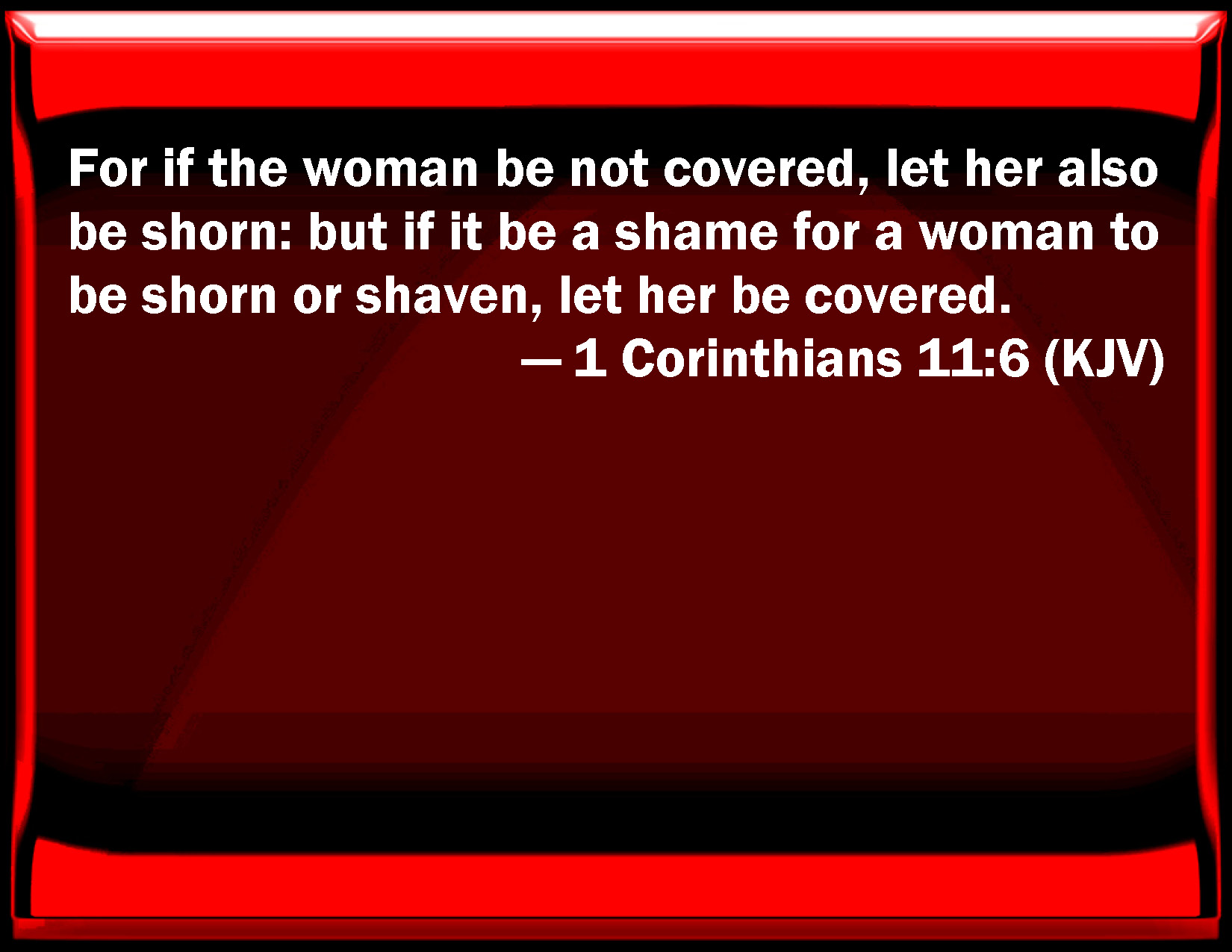 Bible Verse Slide 1 Corinthians 11:6 For if the woman be not covered, let her also be shorn: but if it be a shame for a woman to be shorn or shaven, let her be covered. KJV: For if the woman be not covered, let her also be shorn: but if it be a shame for a woman to be shorn or shaven, let her be covered. DRB: For if a woman be not covered, let her be shorn. But if it be a shame to a woman to be shorn or made bald, let her cover her head. DBT: For if a woman be not covered, let her hair also be cut off. But if it be shameful to a woman to have her hair cut off or to be shaved, let her be covered. ERV: For if a woman is not veiled, let her also be shorn: but if it is a shame to a woman to be shorn or shaven, let her be veiled. WBT: For if the woman is not covered, let her also be shorn: but if it is a shame for a woman to be shorn or shaved, let her be covered. WEB: For if a woman is not covered, let her also be shorn. But if it is shameful for a woman to be shorn or shaved, let her be covered. YLT: for if a woman is not covered — then let her be shorn, and if it is a shame for a woman to be shorn or shaven — let her be covered;Links 1 Corinthians 11:6 NIV • 1 Corinthians 11:6 NLT • 1 Corinthians 11:6 ESV • 1 Corinthians 11:6 NASB • 1 Corinthians 11:6 KJV • 1 Corinthians 11:6 Interlinear • 1 Corinthians 11:6 Commentaries • 1 Corinthians 11:6 Parallel Texts • 1 Corinthians 11:6 Bible Apps • 1 Corinthians 11:6 Parallel • Bible Hub |