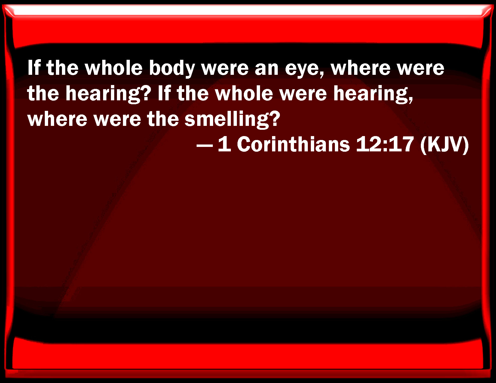 Bible Verse Slide 1 Corinthians 12:17 If the whole body were an eye, where were the hearing? If the whole were hearing, where were the smelling? KJV: If the whole body were an eye, where were the hearing? If the whole were hearing, where were the smelling? DRB: If the whole body were the eye, where would be the hearing? If the whole were hearing, where would be the smelling? DBT: If the whole body were an eye, where the hearing? if all hearing, where the smelling? ERV: If the whole body were an eye, where were the hearing? If the whole were hearing, where were the smelling? WBT: If the whole body were an eye, where were the hearing? If the whole were hearing, where were the smelling? WEB: If the whole body were an eye, where would the hearing be? If the whole were hearing, where would the smelling be? YLT: If the whole body were an eye, where the hearing? if the whole hearing, where the smelling?Links 1 Corinthians 12:17 NIV • 1 Corinthians 12:17 NLT • 1 Corinthians 12:17 ESV • 1 Corinthians 12:17 NASB • 1 Corinthians 12:17 KJV • 1 Corinthians 12:17 Interlinear • 1 Corinthians 12:17 Commentaries • 1 Corinthians 12:17 Parallel Texts • 1 Corinthians 12:17 Bible Apps • 1 Corinthians 12:17 Parallel • Bible Hub |