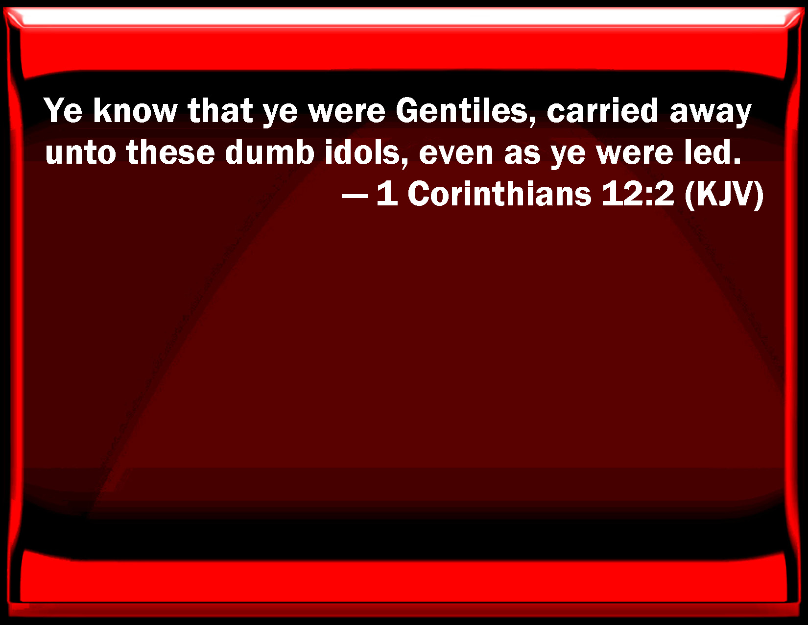 Bible Verse Slide 1 Corinthians 12:2 You know that you were Gentiles, carried away to these dumb idols, even as you were led. KJV: Ye know that ye were Gentiles, carried away unto these dumb idols, even as ye were led. DRB: You know that when you were heathens, you went to dumb idols, according as you were led. DBT: Ye know that when ye were of the nations ye were led away to dumb idols, in whatever way ye might be led. ERV: Ye know that when ye were Gentiles ye were led away unto those dumb idols, howsoever ye might be led. WBT: Ye know that ye were Gentiles, carried away to these dumb idols, even as ye were led. WEB: You know that when you were heathen, you were led away to those mute idols, however you might be led. YLT: ye have known that ye were nations, unto the dumb idols — as ye were led — being carried away;Links 1 Corinthians 12:2 NIV • 1 Corinthians 12:2 NLT • 1 Corinthians 12:2 ESV • 1 Corinthians 12:2 NASB • 1 Corinthians 12:2 KJV • 1 Corinthians 12:2 Interlinear • 1 Corinthians 12:2 Commentaries • 1 Corinthians 12:2 Parallel Texts • 1 Corinthians 12:2 Bible Apps • 1 Corinthians 12:2 Parallel • Bible Hub |