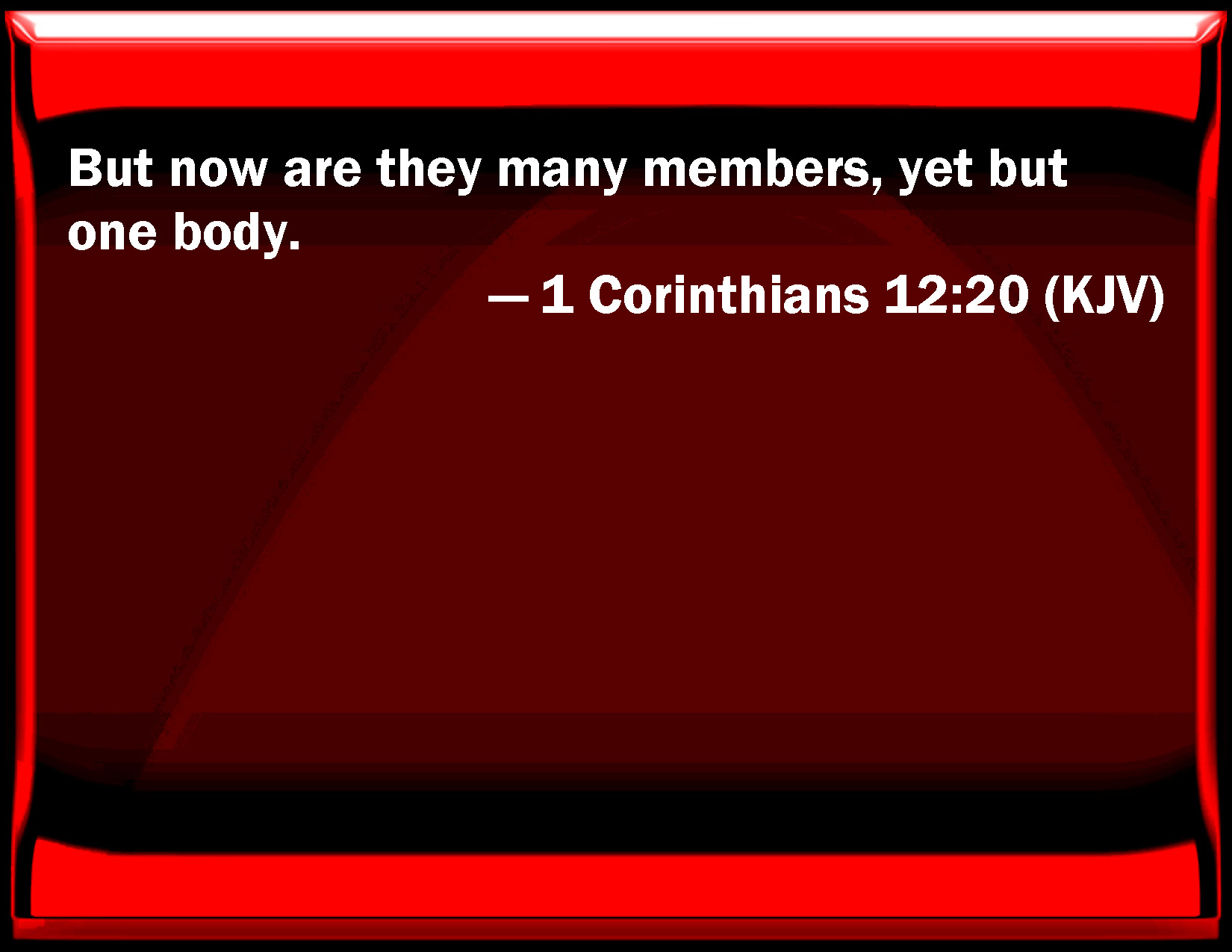 Bible Verse Slide 1 Corinthians 12:20 But now are they many members, yet but one body. KJV: But now are they many members, yet but one body. DRB: But now there are many members indeed, yet one body. DBT: But now the members are many, and the body one. ERV: But now they are many members, but one body. WBT: But now are they many members, yet but one body. WEB: But now they are many members, but one body. YLT: and now, indeed, are many members, and one body;Links 1 Corinthians 12:20 NIV • 1 Corinthians 12:20 NLT • 1 Corinthians 12:20 ESV • 1 Corinthians 12:20 NASB • 1 Corinthians 12:20 KJV • 1 Corinthians 12:20 Interlinear • 1 Corinthians 12:20 Commentaries • 1 Corinthians 12:20 Parallel Texts • 1 Corinthians 12:20 Bible Apps • 1 Corinthians 12:20 Parallel • Bible Hub |