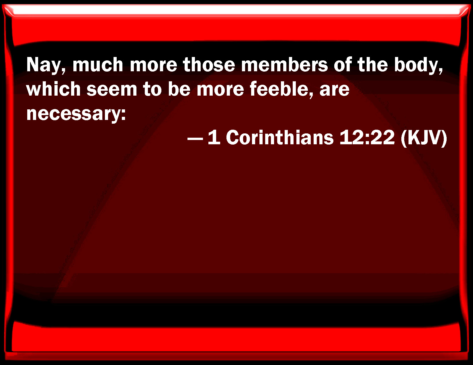 Bible Verse Slide 1 Corinthians 12:22 No, much more those members of the body, which seem to be more feeble, are necessary: KJV: Nay, much more those members of the body, which seem to be more feeble, are necessary: DRB: Yea, much more those that seem to be the more feeble members of the body, are more necessary. DBT: But much rather, the members of the body which seem to be weaker are necessary; ERV: Nay, much rather, those members of the body which seem to be more feeble are necessary: WBT: Nay, much more those members of the body, which seem to be more feeble, are necessary: WEB: No, much rather, those members of the body which seem to be weaker are necessary. YLT: But much more the members of the body which seem to be more infirm are necessary,Links 1 Corinthians 12:22 NIV • 1 Corinthians 12:22 NLT • 1 Corinthians 12:22 ESV • 1 Corinthians 12:22 NASB • 1 Corinthians 12:22 KJV • 1 Corinthians 12:22 Interlinear • 1 Corinthians 12:22 Commentaries • 1 Corinthians 12:22 Parallel Texts • 1 Corinthians 12:22 Bible Apps • 1 Corinthians 12:22 Parallel • Bible Hub |
