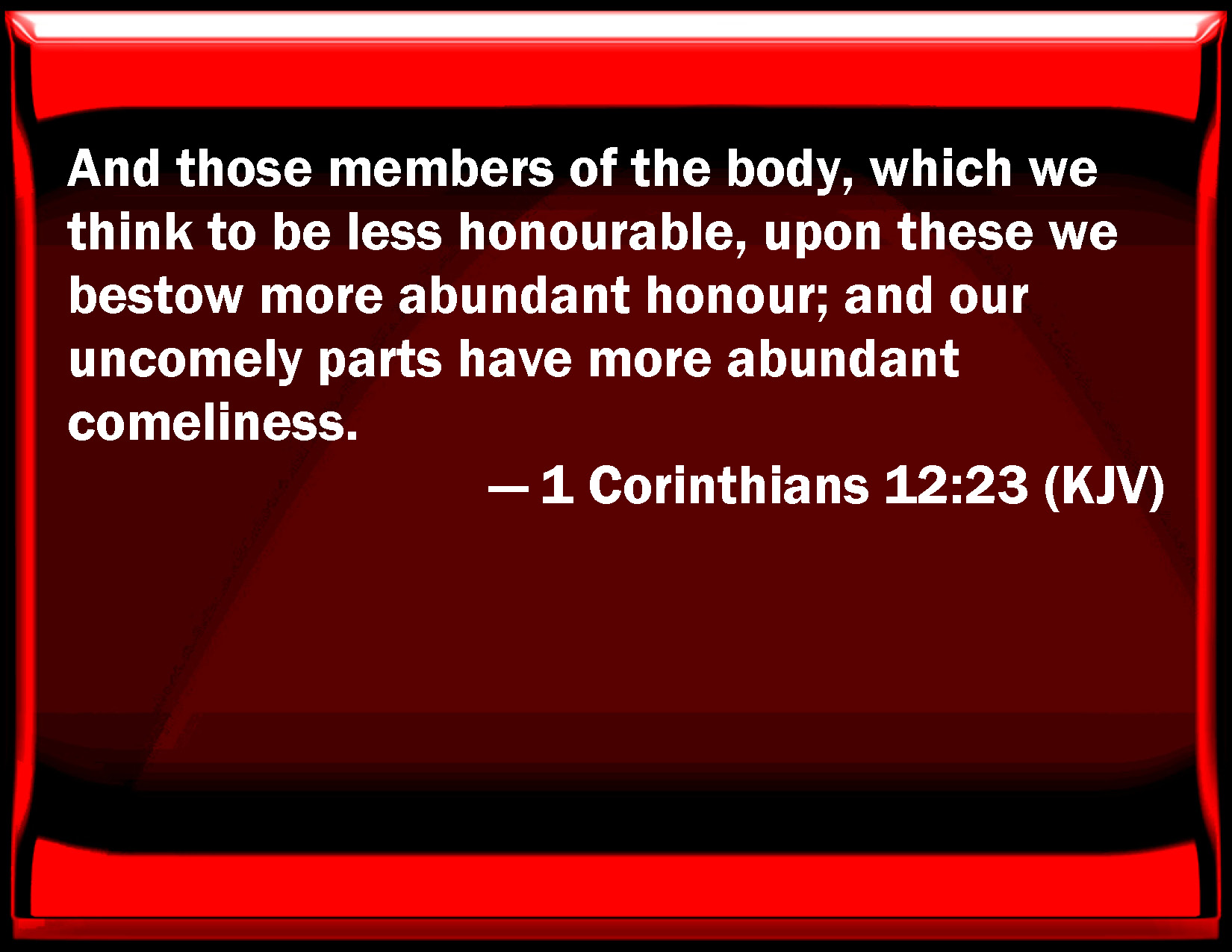 Bible Verse Slide 1 Corinthians 12:23 And those members of the body, which we think to be less honorable, on these we bestow more abundant honor; and our uncomely parts have more abundant comeliness. KJV: And those members of the body, which we think to be less honourable, upon these we bestow more abundant honour; and our uncomely parts have more abundant comeliness. DRB: And such as we think to be the less honourable members of the body, about these we put more abundant honour; and those that are our uncomely parts, have more abundant comeliness. DBT: and those parts of the body which we esteem to be the more void of honour, these we clothe with more abundant honour; and our uncomely parts have more abundant comeliness; ERV: and those parts of the body, which we think to be less honourable, upon these we bestow more abundant honour; and our uncomely parts have more abundant comeliness; WBT: And those members of the body, which we think to be less honorable, upon these we bestow more abundant honor; and our uncomely parts have more abundant comeliness. WEB: Those parts of the body which we think to be less honorable, on those we bestow more abundant honor; and our unpresentable parts have more abundant propriety; YLT: and those that we think to be less honourable of the body, around these we put more abundant honour, and our unseemly things have seemliness more abundant,Links 1 Corinthians 12:23 NIV • 1 Corinthians 12:23 NLT • 1 Corinthians 12:23 ESV • 1 Corinthians 12:23 NASB • 1 Corinthians 12:23 KJV • 1 Corinthians 12:23 Interlinear • 1 Corinthians 12:23 Commentaries • 1 Corinthians 12:23 Parallel Texts • 1 Corinthians 12:23 Bible Apps • 1 Corinthians 12:23 Parallel • Bible Hub |
