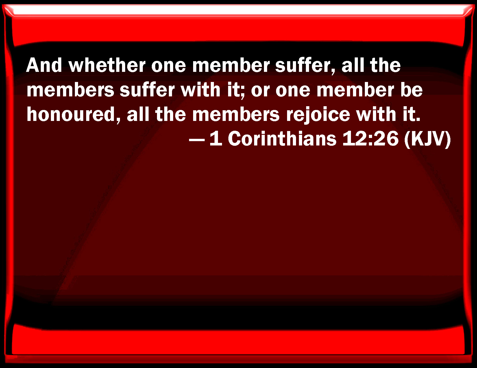 Bible Verse Slide 1 Corinthians 12:26 And whether one member suffer, all the members suffer with it; or one member be honored, all the members rejoice with it. KJV: And whether one member suffer, all the members suffer with it; or one member be honoured, all the members rejoice with it. DRB: And if one member suffer any thing, all the members suffer with it; or if one member glory, all the members rejoice with it. DBT: And if one member suffer, all the members suffer with it; and if one member be glorified, all the members rejoice with it. ERV: And whether one member suffereth, all the members suffer with it; or one member is honoured, all the members rejoice with it. WBT: And thus if one member suffers all the members suffer with it; or, if one member is honored, all the members rejoice with it. WEB: When one member suffers, all the members suffer with it. Or when one member is honored, all the members rejoice with it. YLT: and whether one member doth suffer, suffer with it do all the members, or one member is glorified, rejoice with it do all the members;Links 1 Corinthians 12:26 NIV • 1 Corinthians 12:26 NLT • 1 Corinthians 12:26 ESV • 1 Corinthians 12:26 NASB • 1 Corinthians 12:26 KJV • 1 Corinthians 12:26 Interlinear • 1 Corinthians 12:26 Commentaries • 1 Corinthians 12:26 Parallel Texts • 1 Corinthians 12:26 Bible Apps • 1 Corinthians 12:26 Parallel • Bible Hub |