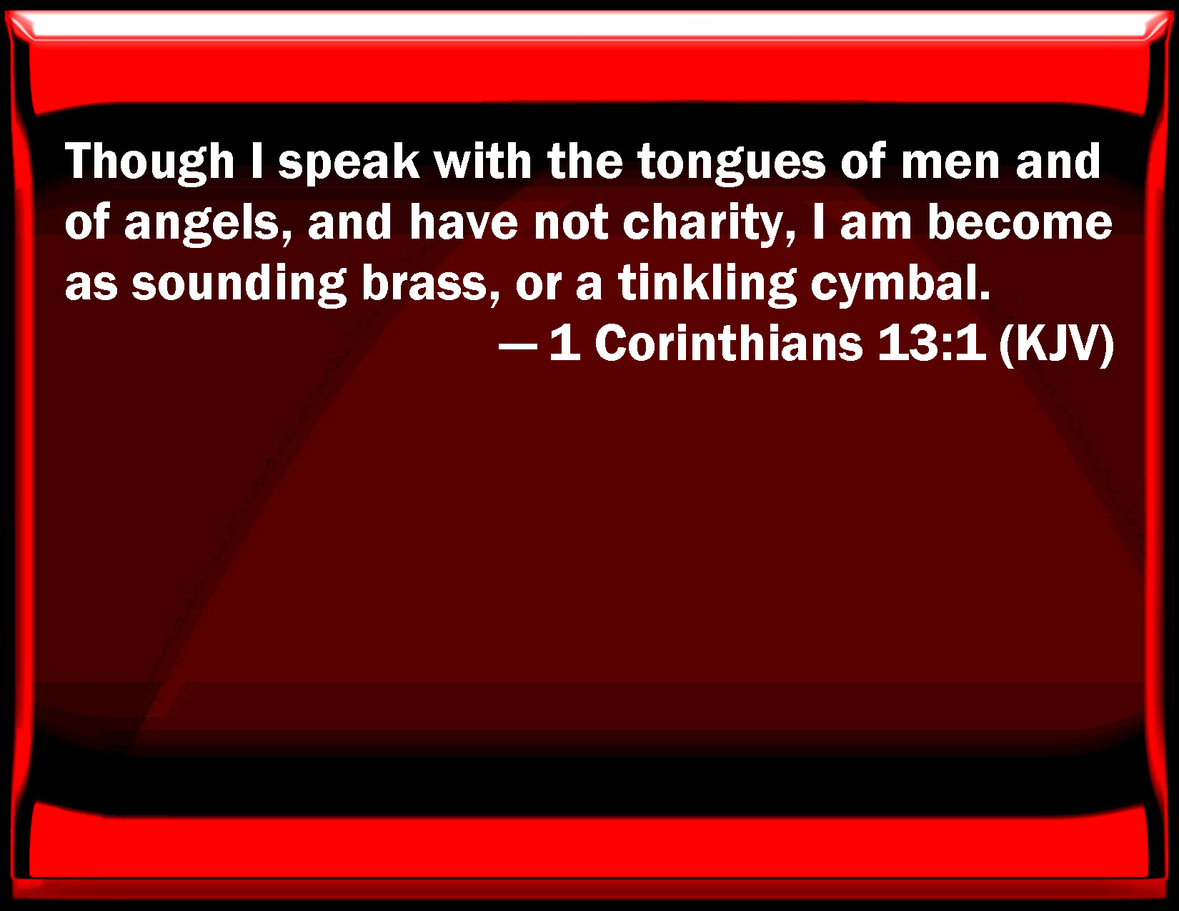 Bible Verse Slide 1 Corinthians 13:1 Though I speak with the tongues of men and of angels, and have not charity, I am become as sounding brass, or a tinkling cymbal. KJV: Though I speak with the tongues of men and of angels, and have not charity, I am become as sounding brass, or a tinkling cymbal. DRB: IF I speak with the tongues of men, and of angels, and have not charity, I am become as sounding brass, or a tinkling cymbal. DBT: If I speak with the tongues of men and of angels, but have not love, I am become sounding brass or a clanging cymbal. ERV: If I speak with the tongues of men and of angels, but have not love, I am become sounding brass, or a clanging cymbal. WBT: Though I speak with the tongues of men and of angels, and have not charity, I am become as sounding brass, or a tinkling cymbal. WEB: If I speak with the languages of men and of angels, but don't have love, I have become sounding brass, or a clanging cymbal. YLT: If with the tongues of men and of messengers I speak, and have not love, I have become brass sounding, or a cymbal tinkling;Links 1 Corinthians 13:1 NIV • 1 Corinthians 13:1 NLT • 1 Corinthians 13:1 ESV • 1 Corinthians 13:1 NASB • 1 Corinthians 13:1 KJV • 1 Corinthians 13:1 Interlinear • 1 Corinthians 13:1 Commentaries • 1 Corinthians 13:1 Parallel Texts • 1 Corinthians 13:1 Bible Apps • 1 Corinthians 13:1 Parallel • Bible Hub |