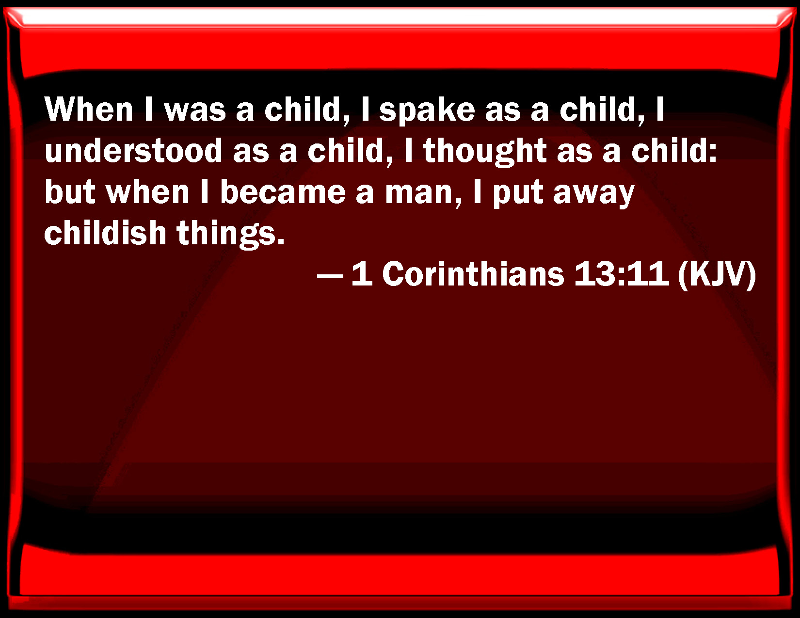 Bible Verse Slide 1 Corinthians 13:11 When I was a child, I spoke as a child, I understood as a child, I thought as a child: but when I became a man, I put away childish things. KJV: When I was a child, I spake as a child, I understood as a child, I thought as a child: but when I became a man, I put away childish things. DRB: When I was a child, I spoke as a child, I understood as a child, I thought as a child. But, when I became a man, I put away the things of a child. DBT: When I was a child, I spoke as a child, I felt as a child, I reasoned as a child; when I became a man, I had done with what belonged to the child. ERV: When I was a child, I spake as a child, I felt as a child, I thought as a child: now that I am become a man, I have put away childish things. WBT: When I was a child, I spoke as a child, I understood as a child, I thought as a child: but when I became a man, I put away childish things. WEB: When I was a child, I spoke as a child, I felt as a child, I thought as a child. Now that I have become a man, I have put away childish things. YLT: When I was a babe, as a babe I was speaking, as a babe I was thinking, as a babe I was reasoning, and when I have become a man, I have made useless the things of the babe;Links 1 Corinthians 13:11 NIV • 1 Corinthians 13:11 NLT • 1 Corinthians 13:11 ESV • 1 Corinthians 13:11 NASB • 1 Corinthians 13:11 KJV • 1 Corinthians 13:11 Interlinear • 1 Corinthians 13:11 Commentaries • 1 Corinthians 13:11 Parallel Texts • 1 Corinthians 13:11 Bible Apps • 1 Corinthians 13:11 Parallel • Bible Hub |