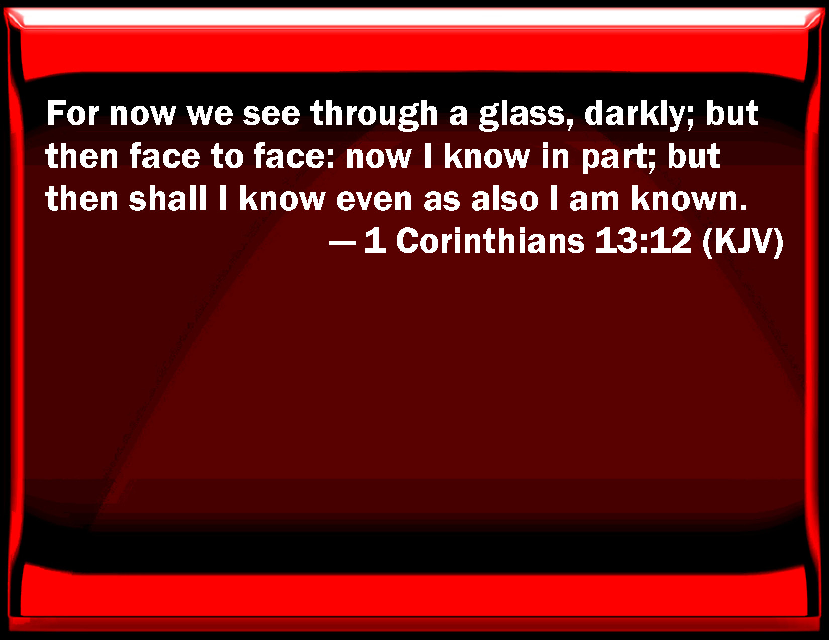 Bible Verse Slide 1 Corinthians 13:12 For now we see through a glass, darkly; but then face to face: now I know in part; but then shall I know even as also I am known. KJV: For now we see through a glass, darkly; but then face to face: now I know in part; but then shall I know even as also I am known. DRB: We see now through a glass in a dark manner; but then face to face. Now I know I part; but then I shall know even as I am known. DBT: For we see now through a dim window obscurely, but then face to face; now I know partially, but then I shall know according as I also have been known. ERV: For now we see in a mirror, darkly; but then face to face: now I know in part; but then shall I know even as also I have been known. WBT: For now we see through a glass darkly; but then face to face: now I know in part; but then shall I know even as also I am known. WEB: For now we see in a mirror, dimly, but then face to face. Now I know in part, but then I will know fully, even as I was also fully known. YLT: for we see now through a mirror obscurely, and then face to face; now I know in part, and then I shall fully know, as also I was known;Links 1 Corinthians 13:12 NIV • 1 Corinthians 13:12 NLT • 1 Corinthians 13:12 ESV • 1 Corinthians 13:12 NASB • 1 Corinthians 13:12 KJV • 1 Corinthians 13:12 Interlinear • 1 Corinthians 13:12 Commentaries • 1 Corinthians 13:12 Parallel Texts • 1 Corinthians 13:12 Bible Apps • 1 Corinthians 13:12 Parallel • Bible Hub |