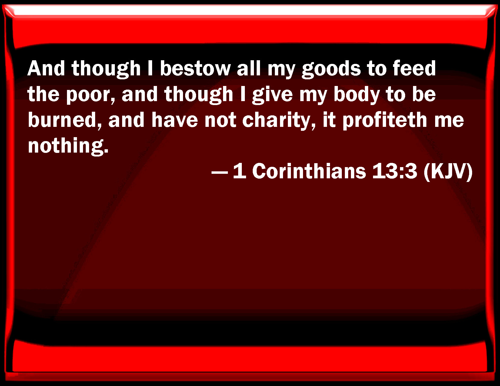 Bible Verse Slide 1 Corinthians 13:3 And though I bestow all my goods to feed the poor, and though I give my body to be burned, and have not charity, it profits me nothing. KJV: And though I bestow all my goods to feed the poor, and though I give my body to be burned, and have not charity, it profiteth me nothing. DRB: And if I should distribute all my goods to feed the poor, and if I should deliver my body to be burned, and have not charity, it profiteth me nothing. DBT: And if I shall dole out all my goods in food, and if I deliver up my body that I may be burned, but have not love, I profit nothing. ERV: And if I bestow all my goods to feed the poor, and if I give my body to be burned, but have not love, it profiteth me nothing. WBT: And though I bestow all my goods to feed the poor, and though I give my body to be burned, and have not charity, it profiteth me nothing. WEB: If I dole out all my goods to feed the poor, and if I give my body to be burned, but don't have love, it profits me nothing. YLT: and if I give away to feed others all my goods, and if I give up my body that I may be burned, and have not love, I am profited nothing.Links 1 Corinthians 13:3 NIV • 1 Corinthians 13:3 NLT • 1 Corinthians 13:3 ESV • 1 Corinthians 13:3 NASB • 1 Corinthians 13:3 KJV • 1 Corinthians 13:3 Interlinear • 1 Corinthians 13:3 Commentaries • 1 Corinthians 13:3 Parallel Texts • 1 Corinthians 13:3 Bible Apps • 1 Corinthians 13:3 Parallel • Bible Hub |