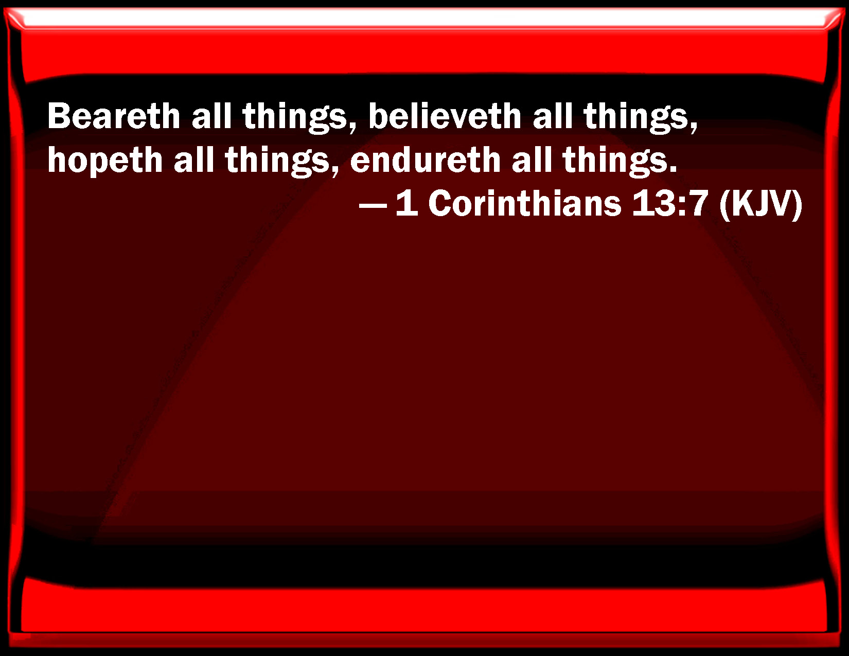 Bible Verse Slide 1 Corinthians 13:7 Bears all things, believes all things, hopes all things, endures all things. KJV: Beareth all things, believeth all things, hopeth all things, endureth all things. DRB: Beareth all things, believeth all things, hopeth all things, endureth all things. DBT: bears all things, believes all things, hopes all things, endures all things. ERV: beareth all things, believeth all things, hopeth all things, endureth all things. WBT: Beareth all things, believeth all things, hopeth all things, endureth all things. WEB: bears all things, believes all things, hopes all things, endures all things. YLT: all things it beareth, all it believeth, all it hopeth, all it endureth.Links 1 Corinthians 13:7 NIV • 1 Corinthians 13:7 NLT • 1 Corinthians 13:7 ESV • 1 Corinthians 13:7 NASB • 1 Corinthians 13:7 KJV • 1 Corinthians 13:7 Interlinear • 1 Corinthians 13:7 Commentaries • 1 Corinthians 13:7 Parallel Texts • 1 Corinthians 13:7 Bible Apps • 1 Corinthians 13:7 Parallel • Bible Hub |