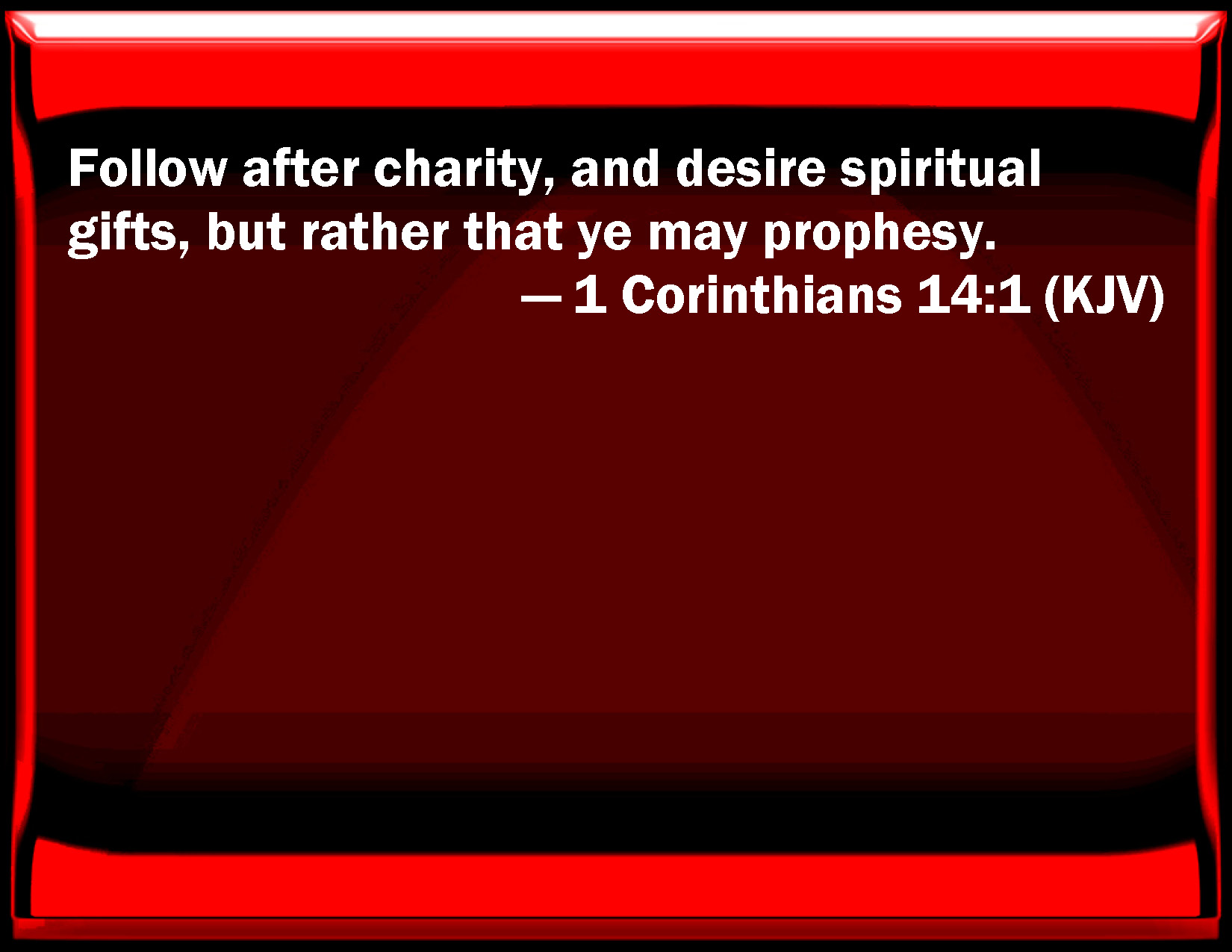 Bible Verse Slide 1 Corinthians 14:1 Follow after charity, and desire spiritual gifts, but rather that you may prophesy. KJV: Follow after charity, and desire spiritual gifts, but rather that ye may prophesy. DRB: FOLLOW after charity, be zealous for spiritual gifts; but rather that you may prophesy. DBT: Follow after love, and be emulous of spiritual manifestations, but rather that ye may prophesy. ERV: Follow after love; yet desire earnestly spiritual gifts, but rather that ye may prophesy. WBT: Follow after charity, and desire spiritual gifts, but rather that ye may prophesy. WEB: Follow after love, and earnestly desire spiritual gifts, but especially that you may prophesy. YLT: Pursue the love, and seek earnestly the spiritual things, and rather that ye may prophecy,Links 1 Corinthians 14:1 NIV • 1 Corinthians 14:1 NLT • 1 Corinthians 14:1 ESV • 1 Corinthians 14:1 NASB • 1 Corinthians 14:1 KJV • 1 Corinthians 14:1 Interlinear • 1 Corinthians 14:1 Commentaries • 1 Corinthians 14:1 Parallel Texts • 1 Corinthians 14:1 Bible Apps • 1 Corinthians 14:1 Parallel • Bible Hub |