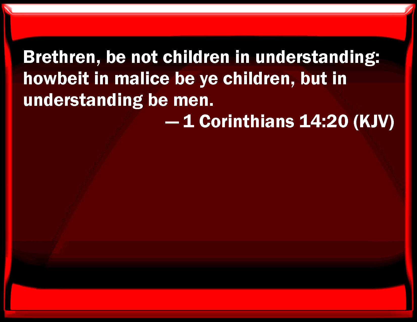 Bible Verse Slide 1 Corinthians 14:20 Brothers, be not children in understanding: however, in malice be you children, but in understanding be men. KJV: Brethren, be not children in understanding: howbeit in malice be ye children, but in understanding be men. DRB: Brethren, do not become children in sense: but in malice be children, and in sense be perfect. DBT: Brethren, be not children in your minds, but in malice be babes; but in your minds be grown men. ERV: Brethren, be not children in mind: howbeit in malice be ye babes, but in mind be men. WBT: Brethren, be not children in understanding: yet in malice be ye children, but in understanding be men. WEB: Brothers, don't be children in thoughts, yet in malice be babies, but in thoughts be mature. YLT: Brethren, become not children in the understanding, but in the evil be ye babes, and in the understanding become ye perfect;Links 1 Corinthians 14:20 NIV • 1 Corinthians 14:20 NLT • 1 Corinthians 14:20 ESV • 1 Corinthians 14:20 NASB • 1 Corinthians 14:20 KJV • 1 Corinthians 14:20 Interlinear • 1 Corinthians 14:20 Commentaries • 1 Corinthians 14:20 Parallel Texts • 1 Corinthians 14:20 Bible Apps • 1 Corinthians 14:20 Parallel • Bible Hub |
