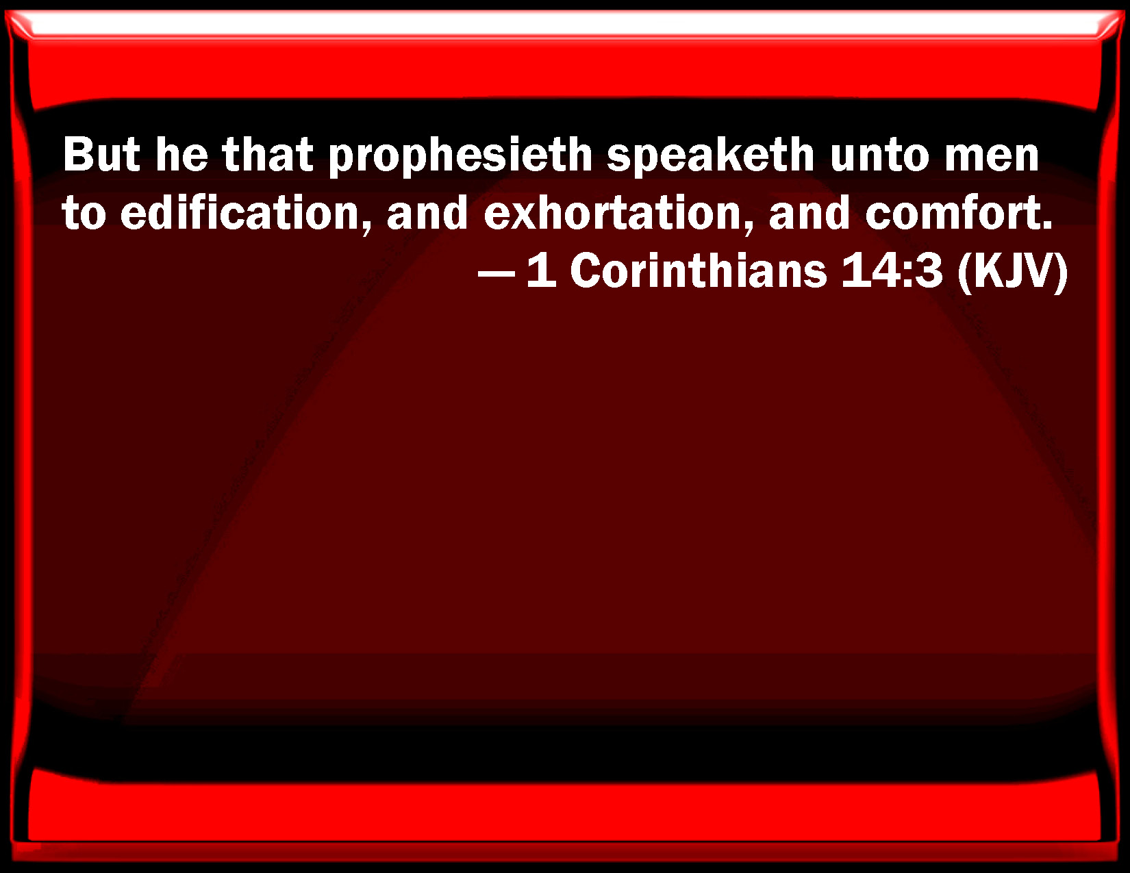 Bible Verse Slide 1 Corinthians 14:3 But he that prophesies speaks to men to edification, and exhortation, and comfort. KJV: But he that prophesieth speaketh unto men to edification, and exhortation, and comfort. DRB: But he that prophesieth, speaketh to men unto edification, and exhortation, and comfort. DBT: But he that prophesies speaks to men in edification, and encouragement, and consolation. ERV: But he that prophesieth speaketh unto men edification, and comfort, and consolation. WBT: But he that prophesieth, speaketh to men to edification, and exhortation, and comfort. WEB: But he who prophesies speaks to men for their edification, exhortation, and consolation. YLT: and he who is prophesying to men doth speak edification, and exhortation, and comfort;Links 1 Corinthians 14:3 NIV • 1 Corinthians 14:3 NLT • 1 Corinthians 14:3 ESV • 1 Corinthians 14:3 NASB • 1 Corinthians 14:3 KJV • 1 Corinthians 14:3 Interlinear • 1 Corinthians 14:3 Commentaries • 1 Corinthians 14:3 Parallel Texts • 1 Corinthians 14:3 Bible Apps • 1 Corinthians 14:3 Parallel • Bible Hub |