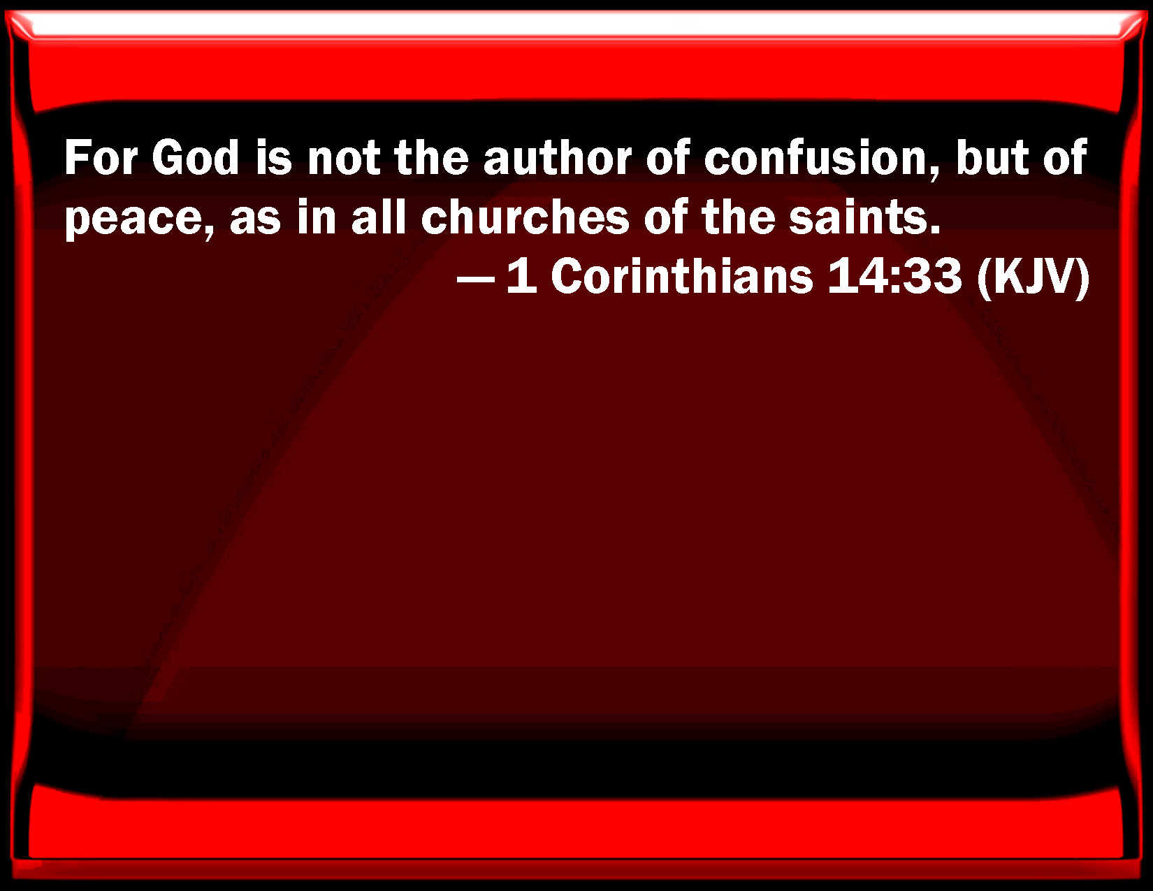 Bible Verse Slide 1 Corinthians 14:33 For God is not the author of confusion, but of peace, as in all churches of the saints. KJV: For God is not the author of confusion, but of peace, as in all churches of the saints. DRB: For God is not the God of dissension, but of peace: as also I teach in all the churches of the saints. DBT: For God is not a God of disorder but of peace, as in all the assemblies of the saints. ERV: for God is not a God of confusion, but of peace; as in all the churches of the saints. WBT: For God is not the author of confusion, but of peace, as in all churches of the saints. WEB: for God is not a God of confusion, but of peace. As in all the assemblies of the saints, YLT: for God is not a God of tumult, but of peace, as in all the assemblies of the saints.Links 1 Corinthians 14:33 NIV • 1 Corinthians 14:33 NLT • 1 Corinthians 14:33 ESV • 1 Corinthians 14:33 NASB • 1 Corinthians 14:33 KJV • 1 Corinthians 14:33 Interlinear • 1 Corinthians 14:33 Commentaries • 1 Corinthians 14:33 Parallel Texts • 1 Corinthians 14:33 Bible Apps • 1 Corinthians 14:33 Parallel • Bible Hub |