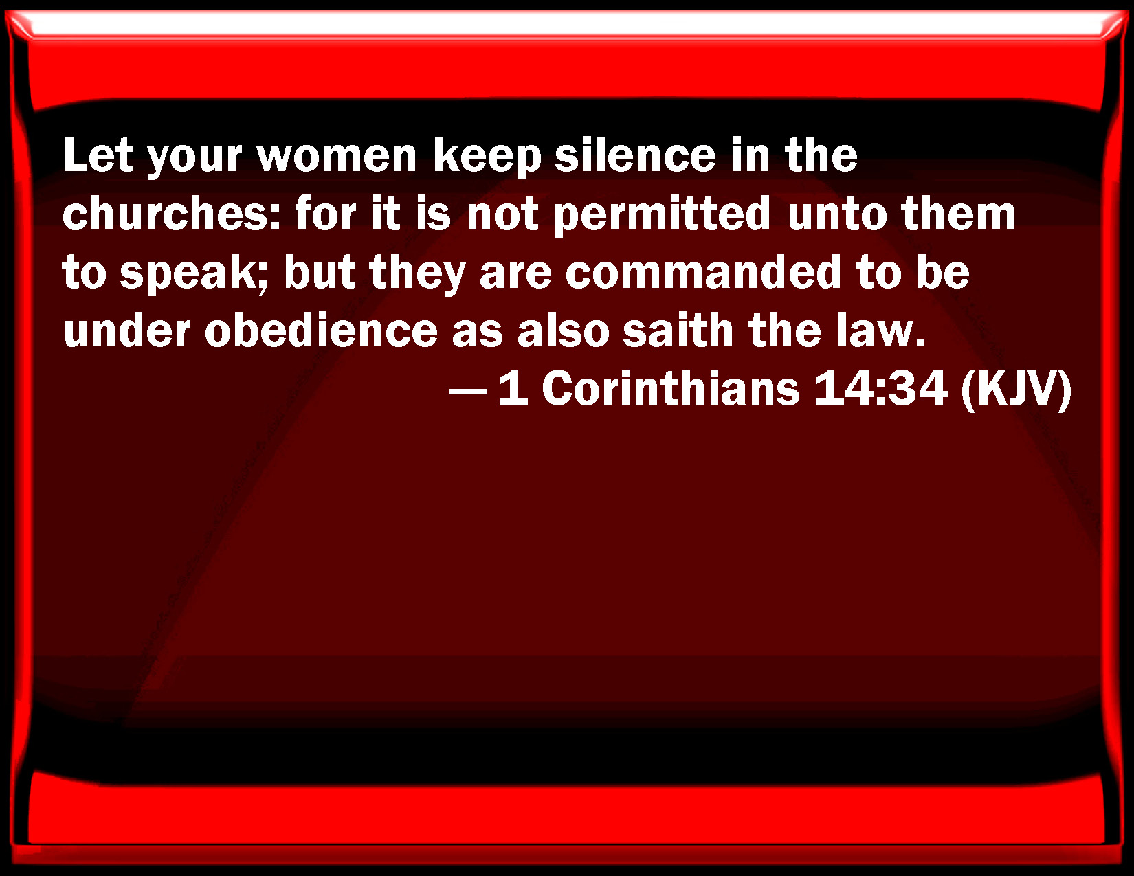 Bible Verse Slide 1 Corinthians 14:34 Let your women keep silence in the churches: for it is not permitted to them to speak; but they are commanded to be under obedience as also said the law. KJV: Let your women keep silence in the churches: for it is not permitted unto them to speak; but they are commanded to be under obedience, as also saith the law. DRB: Let women keep silence in the churches: for it is not permitted them to speak, but to be subject, as also the law saith. DBT: Let your women be silent in the assemblies, for it is not permitted to them to speak; but to be in subjection, as the law also says. ERV: Let the women keep silence in the churches: for it is not permitted unto them to speak; but let them be in subjection, as also saith the law. WBT: Let your women keep silence in the churches; for it is not permitted to them to speak: but they are commanded to be under obedience, as also saith the law. WEB: let your wives keep silent in the assemblies, for it has not been permitted for them to speak; but let them be in subjection, as the law also says. YLT: Your women in the assemblies let them be silent, for it hath not been permitted to them to speak, but to be subject, as also the law saith;Links 1 Corinthians 14:34 NIV • 1 Corinthians 14:34 NLT • 1 Corinthians 14:34 ESV • 1 Corinthians 14:34 NASB • 1 Corinthians 14:34 KJV • 1 Corinthians 14:34 Interlinear • 1 Corinthians 14:34 Commentaries • 1 Corinthians 14:34 Parallel Texts • 1 Corinthians 14:34 Bible Apps • 1 Corinthians 14:34 Parallel • Bible Hub |