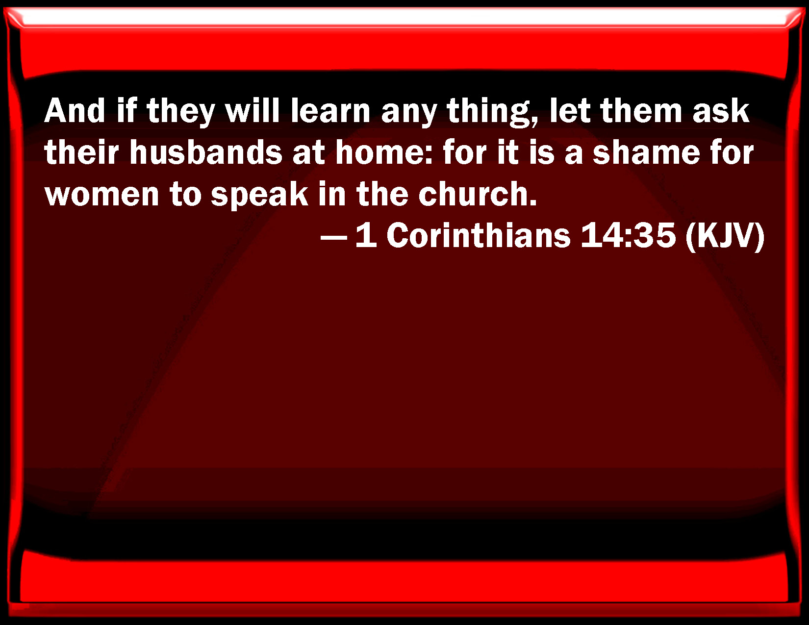 Bible Verse Slide 1 Corinthians 14:35 And if they will learn any thing, let them ask their husbands at home: for it is a shame for women to speak in the church. KJV: And if they will learn any thing, let them ask their husbands at home: for it is a shame for women to speak in the church. DRB: But if they would learn any thing, let them ask their husbands at home. For it is a shame for a woman to speak in the church. DBT: But if they wish to learn anything, let them ask their own husbands at home; for it is a shame for a woman to speak in assembly. ERV: And if they would learn anything, let them ask their own husbands at home: for it is shameful for a woman to speak in the church. WBT: And if they will learn any thing, let them ask their husbands at home; for it is a shame for women to speak in the church. WEB: If they desire to learn anything, let them ask their own husbands at home, for it is shameful for a woman to chatter in the assembly. YLT: and if they wish to learn anything, at home their own husbands let them question, for it is a shame to women to speak in an assembly.Links 1 Corinthians 14:35 NIV • 1 Corinthians 14:35 NLT • 1 Corinthians 14:35 ESV • 1 Corinthians 14:35 NASB • 1 Corinthians 14:35 KJV • 1 Corinthians 14:35 Interlinear • 1 Corinthians 14:35 Commentaries • 1 Corinthians 14:35 Parallel Texts • 1 Corinthians 14:35 Bible Apps • 1 Corinthians 14:35 Parallel • Bible Hub |