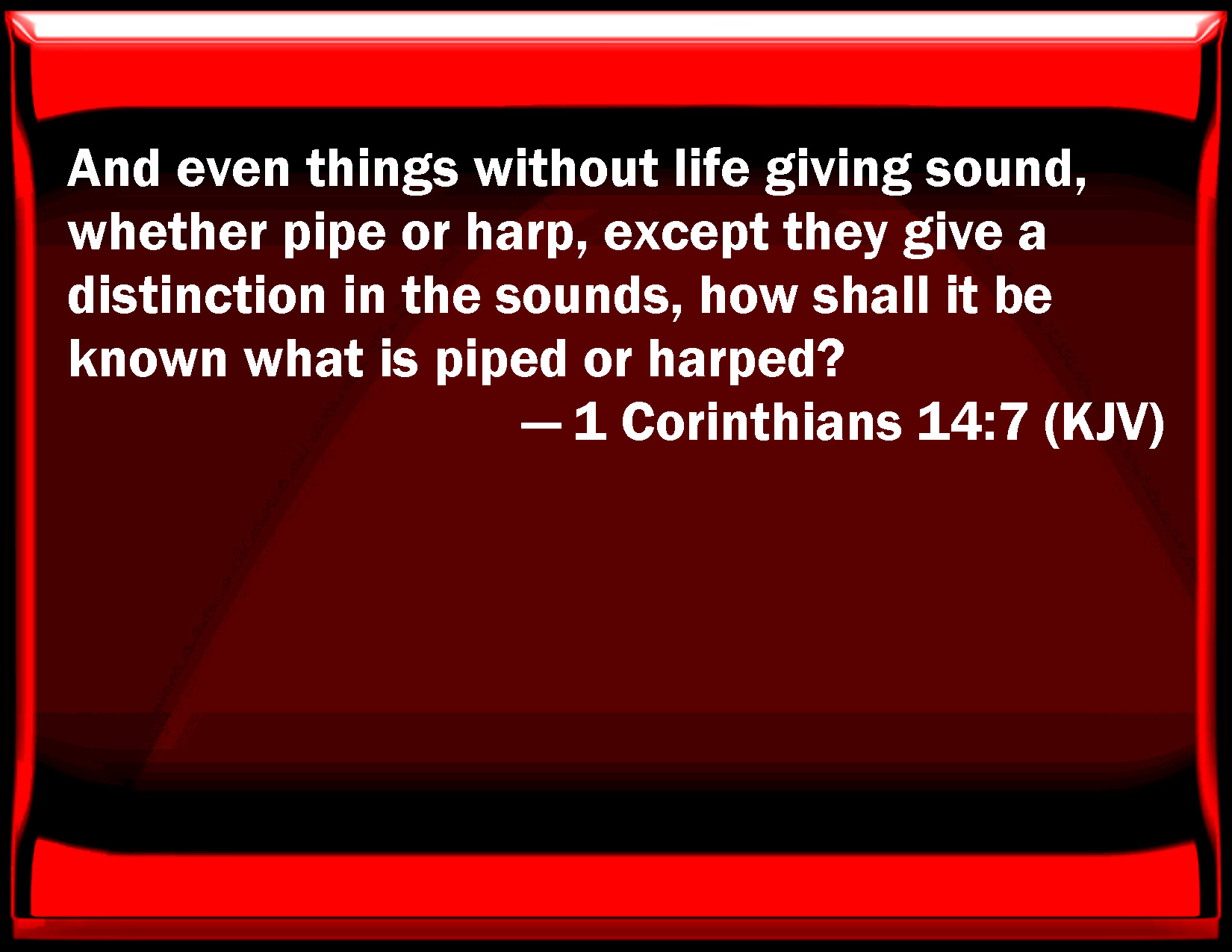 Bible Verse Slide 1 Corinthians 14:7 And even things without life giving sound, whether pipe or harp, except they give a distinction in the sounds, how shall it be known what is piped or harped? KJV: And even things without life giving sound, whether pipe or harp, except they give a distinction in the sounds, how shall it be known what is piped or harped? DRB: Even things without life that give sound, whether pipe or harp, except they give a distinction of sounds, how shall it be known what is piped or harped ? DBT: Even lifeless things giving a sound, whether pipe or harp, if they give not distinction to the sounds, how shall it be known what is piped or harped? ERV: Even things without life, giving a voice, whether pipe or harp, if they give not a distinction in the sounds, how shall it be known what is piped or harped? WBT: And even things without life giving sound, whether pipe or harp, except they give a distinction in the sounds, how shall it be known what is piped or harped? WEB: Even things without life, giving a voice, whether pipe or harp, if they didn't give a distinction in the sounds, how would it be known what is piped or harped? YLT: yet the things without life giving sound — whether pipe or harp — if a difference in the sounds they may not give, how shall be known that which is piped or that which is harped?Links 1 Corinthians 14:7 NIV • 1 Corinthians 14:7 NLT • 1 Corinthians 14:7 ESV • 1 Corinthians 14:7 NASB • 1 Corinthians 14:7 KJV • 1 Corinthians 14:7 Interlinear • 1 Corinthians 14:7 Commentaries • 1 Corinthians 14:7 Parallel Texts • 1 Corinthians 14:7 Bible Apps • 1 Corinthians 14:7 Parallel • Bible Hub |