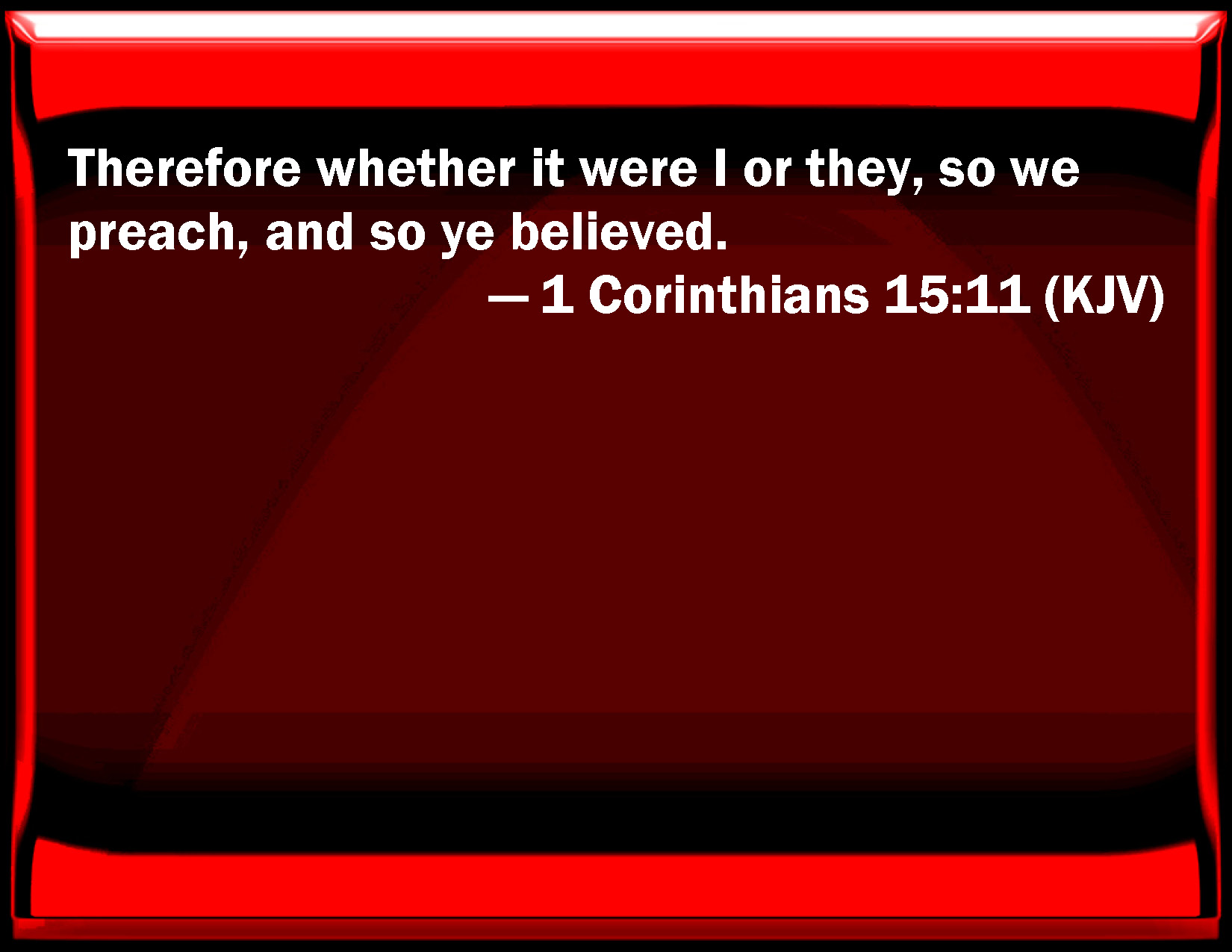 Bible Verse Slide 1 Corinthians 15:11 Therefore whether it were I or they, so we preach, and so you believed. KJV: Therefore whether it were I or they, so we preach, and so ye believed. DRB: For whether I, or they, so we preach, and so you have believed. DBT: Whether, therefore, I or they, thus we preach, and thus ye have believed. ERV: Whether then it be I or they, so we preach, and so ye believed. WBT: Therefore whether it was I or they, so we preach, and so ye believed. WEB: Whether then it is I or they, so we preach, and so you believed. YLT: whether, then, I or they, so we preach, and so ye did believe.Links 1 Corinthians 15:11 NIV • 1 Corinthians 15:11 NLT • 1 Corinthians 15:11 ESV • 1 Corinthians 15:11 NASB • 1 Corinthians 15:11 KJV • 1 Corinthians 15:11 Interlinear • 1 Corinthians 15:11 Commentaries • 1 Corinthians 15:11 Parallel Texts • 1 Corinthians 15:11 Bible Apps • 1 Corinthians 15:11 Parallel • Bible Hub |