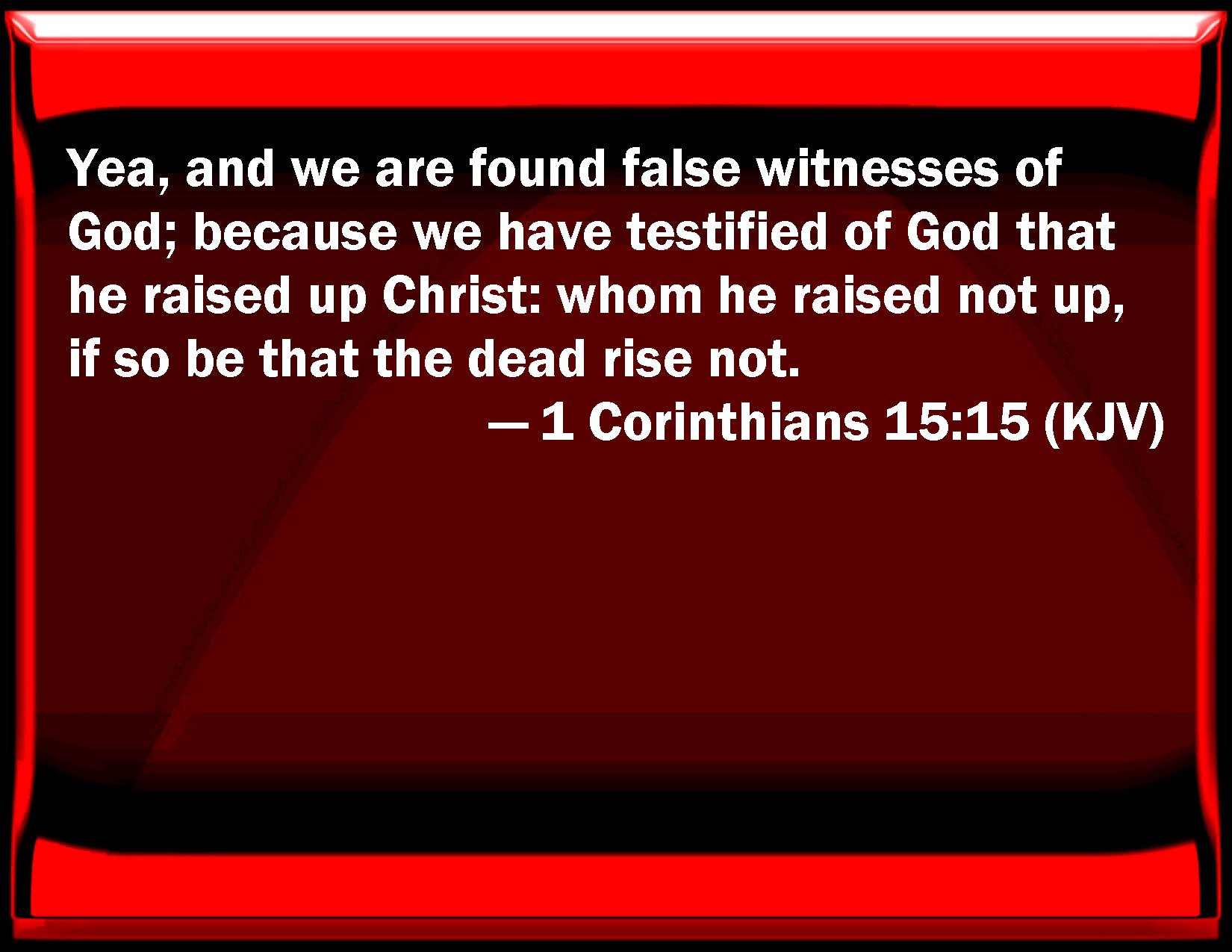 Bible Verse Slide 1 Corinthians 15:15 Yes, and we are found false witnesses of God; because we have testified of God that he raised up Christ: whom he raised not up, if so be that the dead rise not. KJV: Yea, and we are found false witnesses of God; because we have testified of God that he raised up Christ: whom he raised not up, if so be that the dead rise not. DRB: Yea, and we are found false witnesses of God: because we have given testimony against God, that he hath raised up Christ; whom he hath not raised up, if the dead rise not again. DBT: And we are found also false witnesses of God; for we have witnessed concerning God that he raised the Christ, whom he has not raised if indeed those that are dead are not raised. ERV: Yea, and we are found false witnesses of God; because we witnessed of God that he raised up Christ: whom he raised not up, if so be that the dead are not raised. WBT: And indeed we are found false witnesses of God; because we have testified concerning God that he raised up Christ: whom he raised not, if in truth the dead rise not. WEB: Yes, we are found false witnesses of God, because we testified about God that he raised up Christ, whom he didn't raise up, if it is so that the dead are not raised. YLT: and we also are found false witnesses of God, because we did testify of God that He raised up the Christ, whom He did not raise if then dead persons do not rise;Links 1 Corinthians 15:15 NIV • 1 Corinthians 15:15 NLT • 1 Corinthians 15:15 ESV • 1 Corinthians 15:15 NASB • 1 Corinthians 15:15 KJV • 1 Corinthians 15:15 Interlinear • 1 Corinthians 15:15 Commentaries • 1 Corinthians 15:15 Parallel Texts • 1 Corinthians 15:15 Bible Apps • 1 Corinthians 15:15 Parallel • Bible Hub |