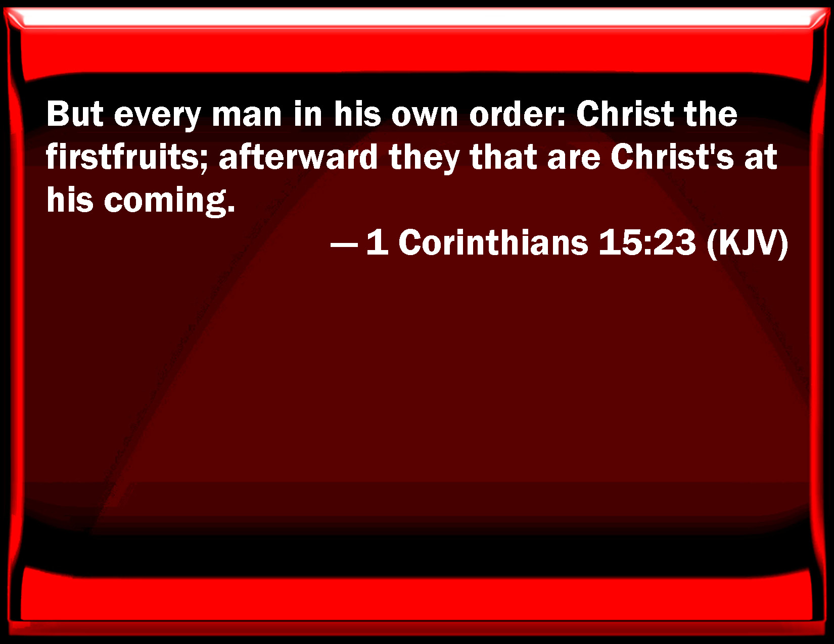 Bible Verse Slide 1 Corinthians 15:23 But every man in his own order: Christ the first fruits; afterward they that are Christ's at his coming. KJV: But every man in his own order: Christ the firstfruits; afterward they that are Christ's at his coming. DRB: But every one in his own order: the firstfruits Christ, then they that are of Christ, who have believed in his coming. DBT: But each in his own rank: the first-fruits, Christ; then those that are the Christ's at his coming. ERV: But each in his own order: Christ the firstfruits; then they that are Christ's, at his coming. WBT: But every man in his own order: Christ the first-fruits; afterward they that are Christ's at his coming. WEB: But each in his own order: Christ the first fruits, then those who are Christ's, at his coming. YLT: and each in his proper order, a first-fruit Christ, afterwards those who are the Christ's, in his presence,Links 1 Corinthians 15:23 NIV • 1 Corinthians 15:23 NLT • 1 Corinthians 15:23 ESV • 1 Corinthians 15:23 NASB • 1 Corinthians 15:23 KJV • 1 Corinthians 15:23 Interlinear • 1 Corinthians 15:23 Commentaries • 1 Corinthians 15:23 Parallel Texts • 1 Corinthians 15:23 Bible Apps • 1 Corinthians 15:23 Parallel • Bible Hub |