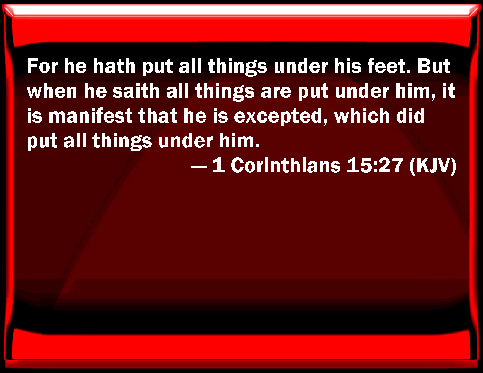 Bible Verse Slide 1 Corinthians 15:27 For he has put all things under his feet. But when he said all things are put under him, it is manifest that he is excepted, which did put all things under him. KJV: For he hath put all things under his feet. But when he saith, all things are put under him, it is manifest that he is excepted, which did put all things under him. DRB: All things are put under him; undoubtedly, he is excepted, who put all things under him. DBT: For he has put all things in subjection under his feet. But when he says that all things are put in subjection, it is evident that it is except him who put all things in subjection to him. ERV: For, He put all things in subjection under his feet. But when he saith, All things are put in subjection, it is evident that he is excepted who did subject all things unto him. WBT: For he hath put all things under his feet. But when he saith, all things are put under him, it is manifest that he is excepted who did put all things under him. WEB: For, "He put all things in subjection under his feet." But when he says, "All things are put in subjection," it is evident that he is excepted who subjected all things to him. YLT: for all things He did put under his feet, and, when one may say that all things have been subjected, it is evident that He is excepted who did subject the all things to him,Links 1 Corinthians 15:27 NIV • 1 Corinthians 15:27 NLT • 1 Corinthians 15:27 ESV • 1 Corinthians 15:27 NASB • 1 Corinthians 15:27 KJV • 1 Corinthians 15:27 Interlinear • 1 Corinthians 15:27 Commentaries • 1 Corinthians 15:27 Parallel Texts • 1 Corinthians 15:27 Bible Apps • 1 Corinthians 15:27 Parallel • Bible Hub |