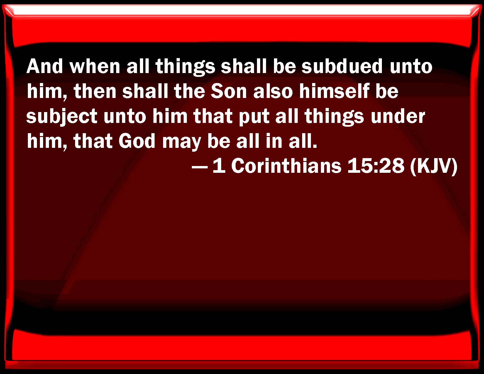 Bible Verse Slide 1 Corinthians 15:28 And when all things shall be subdued to him, then shall the Son also himself be subject to him that put all things under him, that God may be all in all. KJV: And when all things shall be subdued unto him, then shall the Son also himself be subject unto him that put all things under him, that God may be all in all. DRB: And when all things shall be subdued unto him, then the Son also himself shall be subject unto him that put all things under him, that God may be all in all. DBT: But when all things shall have been brought into subjection to him, then the Son also himself shall be placed in subjection to him who put all things in subjection to him, that God may be all in all.) ERV: And when all things have been subjected unto him, then shall the Son also himself be subjected to him that did subject all things unto him, that God may be all in all. WBT: And when all things shall be subdued to him, then shall the Son also himself be subject to him that put all things under him, that God may be all in all. WEB: When all things have been subjected to him, then the Son will also himself be subjected to him who subjected all things to him, that God may be all in all. YLT: and when the all things may be subjected to him, then the Son also himself shall be subject to Him, who did subject to him the all things, that God may be the all in all.Links 1 Corinthians 15:28 NIV • 1 Corinthians 15:28 NLT • 1 Corinthians 15:28 ESV • 1 Corinthians 15:28 NASB • 1 Corinthians 15:28 KJV • 1 Corinthians 15:28 Interlinear • 1 Corinthians 15:28 Commentaries • 1 Corinthians 15:28 Parallel Texts • 1 Corinthians 15:28 Bible Apps • 1 Corinthians 15:28 Parallel • Bible Hub |