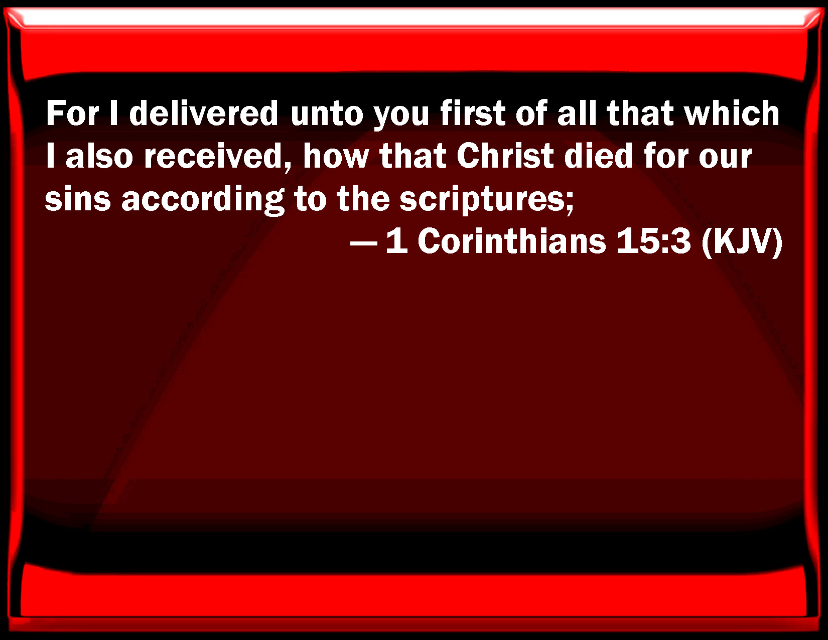 Bible Verse Slide 1 Corinthians 15:3 For I delivered to you first of all that which I also received, how that Christ died for our sins according to the scriptures; KJV: For I delivered unto you first of all that which I also received, how that Christ died for our sins according to the scriptures; DRB: For I delivered unto you first of all, which I also received: how that Christ died for our sins, according to the scriptures: DBT: For I delivered to you, in the first place, what also I had received, that Christ died for our sins, according to the scriptures; ERV: For I delivered unto you first of all that which also I received, how that Christ died for our sins according to the scriptures; WBT: For I delivered to you first of all, that which I also received, that Christ died for our sins, according to the scriptures; WEB: For I delivered to you first of all that which I also received: that Christ died for our sins according to the Scriptures, YLT: for I delivered to you first, what also I did receive, that Christ died for our sins, according to the Writings,Links 1 Corinthians 15:3 NIV • 1 Corinthians 15:3 NLT • 1 Corinthians 15:3 ESV • 1 Corinthians 15:3 NASB • 1 Corinthians 15:3 KJV • 1 Corinthians 15:3 Interlinear • 1 Corinthians 15:3 Commentaries • 1 Corinthians 15:3 Parallel Texts • 1 Corinthians 15:3 Bible Apps • 1 Corinthians 15:3 Parallel • Bible Hub |