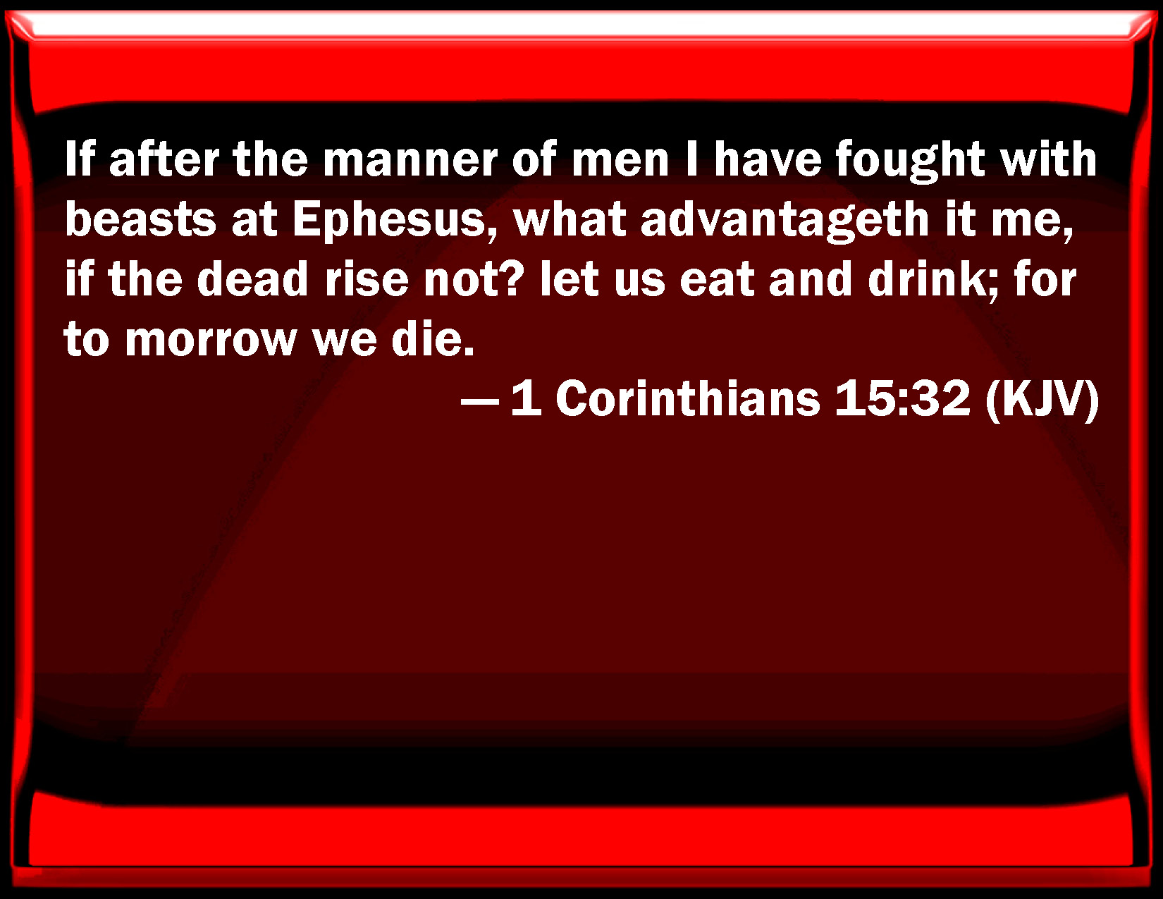 Bible Verse Slide 1 Corinthians 15:32 If after the manner of men I have fought with beasts at Ephesus, what advantages it me, if the dead rise not? let us eat and drink; for to morrow we die. KJV: If after the manner of men I have fought with beasts at Ephesus, what advantageth it me, if the dead rise not? let us eat and drink; for to morrow we die. DRB: If (according to man) I fought with beasts at Ephesus, what doth it profit me, if the dead rise not again? Let us eat and drink, for to morrow we shall die. DBT: If, to speak after the manner of man, I have fought with beasts in Ephesus, what is the profit to me if those that are dead do not rise? let us eat and drink; for to-morrow we die. ERV: If after the manner of men I fought with beasts at Ephesus, what doth it profit me? If the dead are not raised, let us eat and drink, for tomorrow we die. WBT: If after the manner of men I have fought with beasts at Ephesus, what advantage is it to me, if the dead rise not? let us eat and drink; for to-morrow we die. WEB: If I fought with animals at Ephesus for human purposes, what does it profit me? If the dead are not raised, then "let us eat and drink, for tomorrow we die." YLT: if after the manner of a man with wild beasts I fought in Ephesus, what the advantage to me if the dead do not rise? let us eat and drink, for to-morrow we die!Links 1 Corinthians 15:32 NIV • 1 Corinthians 15:32 NLT • 1 Corinthians 15:32 ESV • 1 Corinthians 15:32 NASB • 1 Corinthians 15:32 KJV • 1 Corinthians 15:32 Interlinear • 1 Corinthians 15:32 Commentaries • 1 Corinthians 15:32 Parallel Texts • 1 Corinthians 15:32 Bible Apps • 1 Corinthians 15:32 Parallel • Bible Hub |