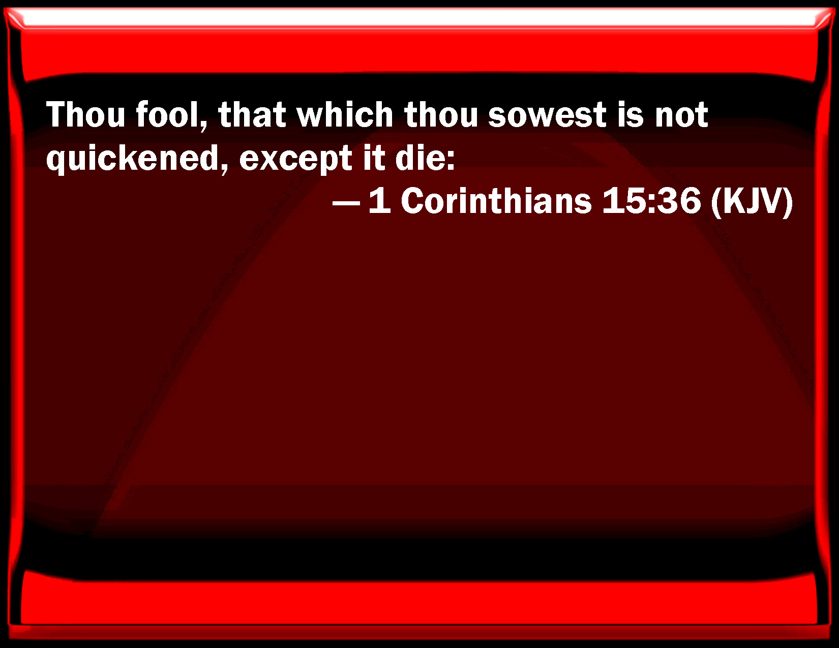 Bible Verse Slide 1 Corinthians 15:36 You fool, that which you sow is not quickened, except it die: KJV: Thou fool, that which thou sowest is not quickened, except it die: DRB: Senseless man, that which thou sowest is not quickened, except it die first. DBT: Fool; what thou sowest is not quickened unless it die. ERV: Thou foolish one, that which thou thyself sowest is not quickened, except it die: WBT: Thou fool, that which thou sowest is not vivified except it die: WEB: You foolish one, that which you yourself sow is not made alive unless it dies. YLT: unwise! thou — what thou dost sow is not quickened except it may die;Links 1 Corinthians 15:36 NIV • 1 Corinthians 15:36 NLT • 1 Corinthians 15:36 ESV • 1 Corinthians 15:36 NASB • 1 Corinthians 15:36 KJV • 1 Corinthians 15:36 Interlinear • 1 Corinthians 15:36 Commentaries • 1 Corinthians 15:36 Parallel Texts • 1 Corinthians 15:36 Bible Apps • 1 Corinthians 15:36 Parallel • Bible Hub |