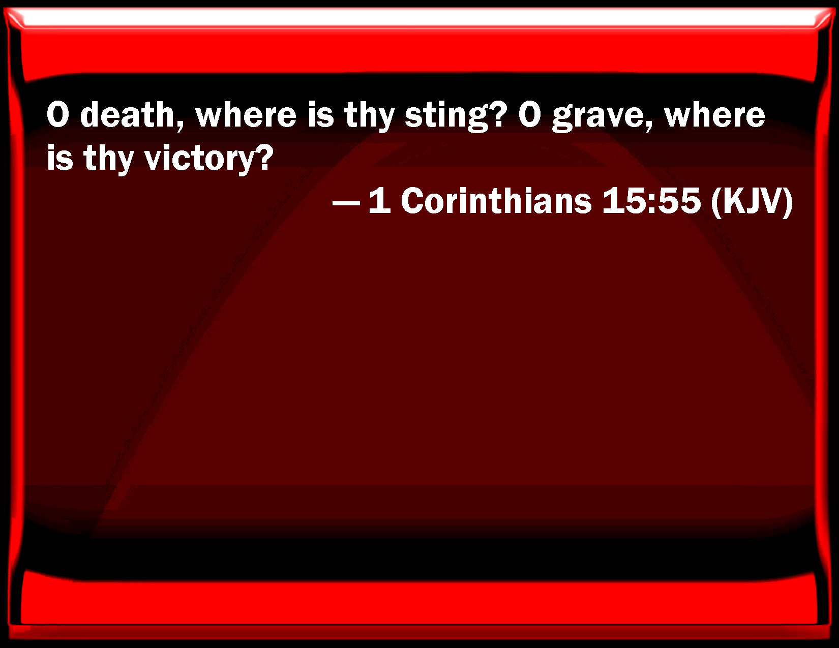 Bible Verse Slide 1 Corinthians 15:55 O death, where is your sting? O grave, where is your victory? KJV: O death, where is thy sting? O grave, where is thy victory? DRB: O death, where is thy victory? O death, where is thy sting? DBT: Where, O death, is thy sting? where, O death, thy victory? ERV: O death, where is thy victory? O death, where is thy sting? WBT: O death, where is thy sting? O grave, where is thy victory? WEB: "Death, where is your sting? Hades, where is your victory?" YLT: where, O Death, thy sting? where, O Hades, thy victory?'Links 1 Corinthians 15:55 NIV • 1 Corinthians 15:55 NLT • 1 Corinthians 15:55 ESV • 1 Corinthians 15:55 NASB • 1 Corinthians 15:55 KJV • 1 Corinthians 15:55 Interlinear • 1 Corinthians 15:55 Commentaries • 1 Corinthians 15:55 Parallel Texts • 1 Corinthians 15:55 Bible Apps • 1 Corinthians 15:55 Parallel • Bible Hub |