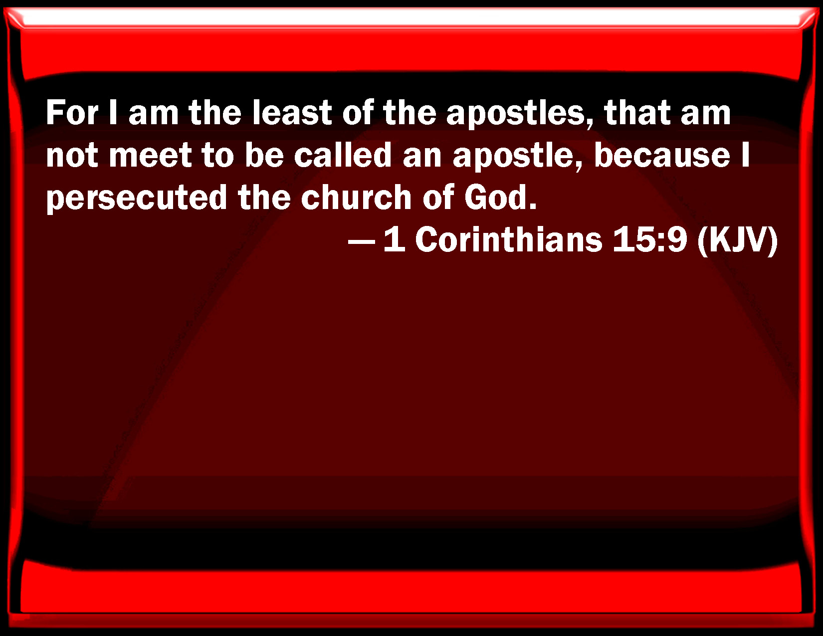 Bible Verse Slide 1 Corinthians 15:9 For I am the least of the apostles, that am not meet to be called an apostle, because I persecuted the church of God. KJV: For I am the least of the apostles, that am not meet to be called an apostle, because I persecuted the church of God. DRB: For I am the least of the apostles, who am not worthy to be called an apostle, because I persecuted the church of God. DBT: For I am the least of the apostles, who am not fit to be called apostle, because I have persecuted the assembly of God. ERV: For I am the least of the apostles, that am not meet to be called an apostle, because I persecuted the church of God. WBT: For I am the least of the apostles, who am not worthy to be called an apostle, because I persecuted the church of God. WEB: For I am the least of the apostles, who is not worthy to be called an apostle, because I persecuted the assembly of God. YLT: for I am the least of the apostles, who am not worthy to be called an apostle, because I did persecute the assembly of God,Links 1 Corinthians 15:9 NIV • 1 Corinthians 15:9 NLT • 1 Corinthians 15:9 ESV • 1 Corinthians 15:9 NASB • 1 Corinthians 15:9 KJV • 1 Corinthians 15:9 Interlinear • 1 Corinthians 15:9 Commentaries • 1 Corinthians 15:9 Parallel Texts • 1 Corinthians 15:9 Bible Apps • 1 Corinthians 15:9 Parallel • Bible Hub |