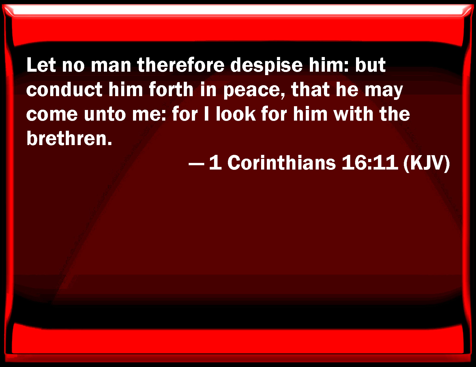 Bible Verse Slide 1 Corinthians 16:11 Let no man therefore despise him: but conduct him forth in peace, that he may come to me: for I look for him with the brothers. KJV: Let no man therefore despise him: but conduct him forth in peace, that he may come unto me: for I look for him with the brethren. DRB: Let no man therefore despise him, but conduct ye him on his way in peace: that he may come to me. For I look for him with the breatheren. DBT: Let not therefore any one despise him; but set him forward in peace, that he may come to me; for I expect him with the brethren. ERV: let no man therefore despise him. But set him forward on his journey in peace, that he may come unto me: for I expect him with the brethren. WBT: Let no man therefore despise him: but conduct him forth in peace, that he may come to me: for I look for him with the brethren. WEB: Therefore let no one despise him. But set him forward on his journey in peace, that he may come to me; for I expect him with the brothers. YLT: no one, then, may despise him; and send ye him forward in peace, that he may come to me, for I expect him with the brethren;Links 1 Corinthians 16:11 NIV • 1 Corinthians 16:11 NLT • 1 Corinthians 16:11 ESV • 1 Corinthians 16:11 NASB • 1 Corinthians 16:11 KJV • 1 Corinthians 16:11 Interlinear • 1 Corinthians 16:11 Commentaries • 1 Corinthians 16:11 Parallel Texts • 1 Corinthians 16:11 Bible Apps • 1 Corinthians 16:11 Parallel • Bible Hub |