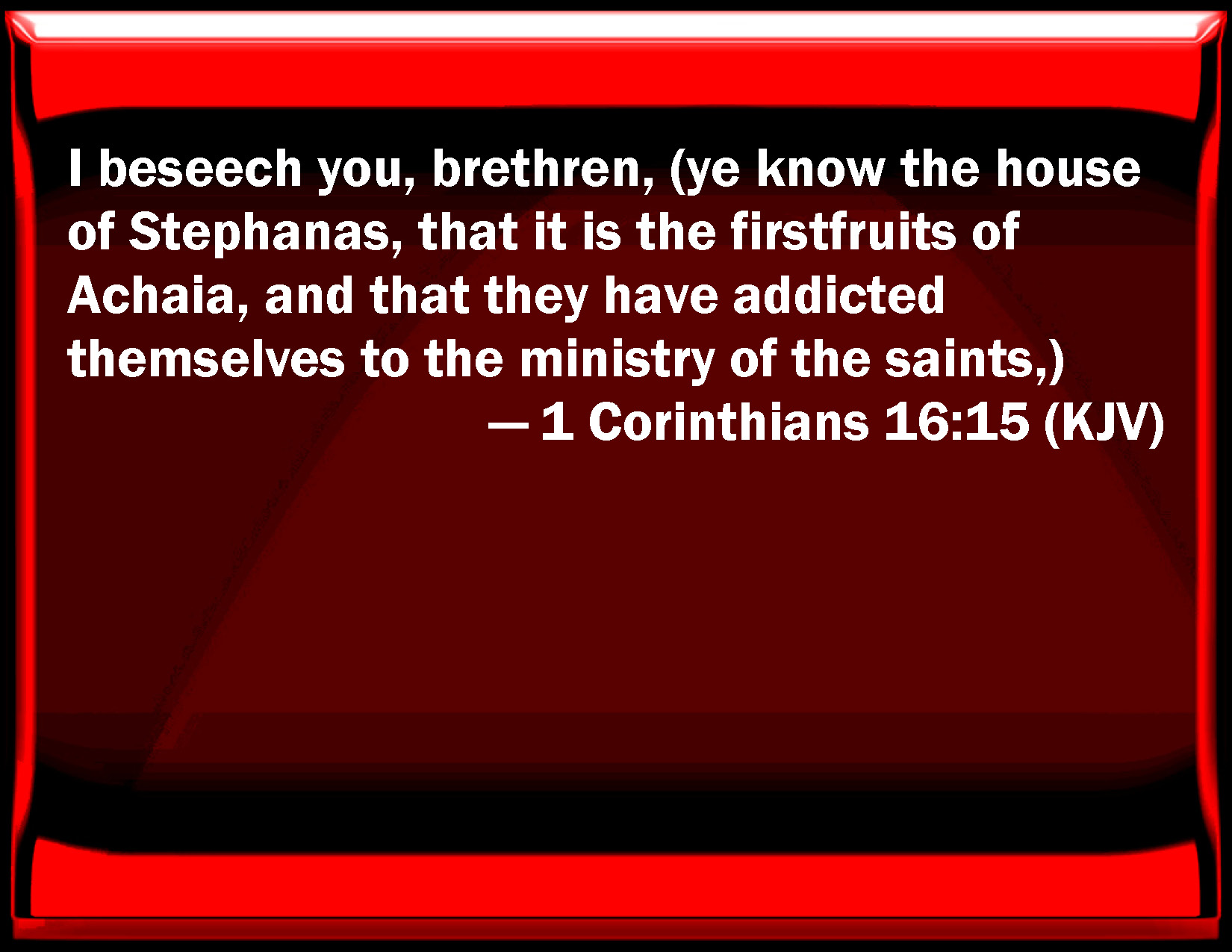 Bible Verse Slide 1 Corinthians 16:15 I beseech you, brothers, (you know the house of Stephanas, that it is the first fruits of Achaia, and that they have addicted themselves to the ministry of the saints,) KJV: I beseech you, brethren, (ye know the house of Stephanas, that it is the firstfruits of Achaia, and that they have addicted themselves to the ministry of the saints,) DRB: And I beseech you, brethren, you know the house of Stephanas, and of Fortunatus, and of Achaicus, that they are the firstfruits of Achaia, and have dedicated themselves to the ministry of the saints: DBT: But I beseech you, brethren, (ye know the house of Stephanas, that it is the first-fruits of Achaia, and they have devoted themselves to the saints for service,) ERV: Now I beseech you, brethren (ye know the house of Stephanas, that it is the firstfruits of Achaia, and that they have set themselves to minister unto the saints), WBT: I beseech you, brethren, (ye know the house of Stephanas, that it is the first fruits of Achaia, and that they have addicted themselves to the ministry of the saints,) WEB: Now I beg you, brothers (you know the house of Stephanas, that it is the first fruits of Achaia, and that they have set themselves to serve the saints), YLT: And I entreat you, brethren, ye have known the household of Stephanas, that it is the first-fruit of Achaia, and to the ministration to the saints they did set themselves — Links 1 Corinthians 16:15 NIV • 1 Corinthians 16:15 NLT • 1 Corinthians 16:15 ESV • 1 Corinthians 16:15 NASB • 1 Corinthians 16:15 KJV • 1 Corinthians 16:15 Interlinear • 1 Corinthians 16:15 Commentaries • 1 Corinthians 16:15 Parallel Texts • 1 Corinthians 16:15 Bible Apps • 1 Corinthians 16:15 Parallel • Bible Hub |