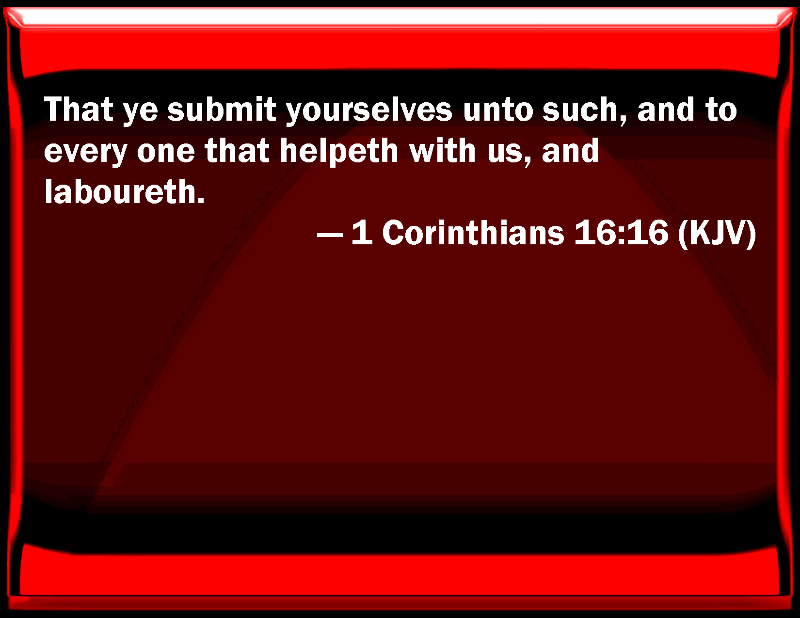 Bible Verse Slide 1 Corinthians 16:16 That you submit yourselves to such, and to every one that helps with us, and labors. KJV: That ye submit yourselves unto such, and to every one that helpeth with us, and laboureth. DRB: That you also be subject to such, and to every one that worketh with us, and laboureth. DBT: that ye should also be subject to such, and to every one joined in the work and labouring. ERV: that ye also be in subjection unto such, and to every one that helpeth in the work and laboureth. WBT: That ye submit yourselves to such, and to every one that helpeth with us, and laboreth. WEB: that you also be in subjection to such, and to everyone who helps in the work and labors. YLT: that ye also be subject to such, and to every one who is working with us and labouring;Links 1 Corinthians 16:16 NIV • 1 Corinthians 16:16 NLT • 1 Corinthians 16:16 ESV • 1 Corinthians 16:16 NASB • 1 Corinthians 16:16 KJV • 1 Corinthians 16:16 Interlinear • 1 Corinthians 16:16 Commentaries • 1 Corinthians 16:16 Parallel Texts • 1 Corinthians 16:16 Bible Apps • 1 Corinthians 16:16 Parallel • Bible Hub |